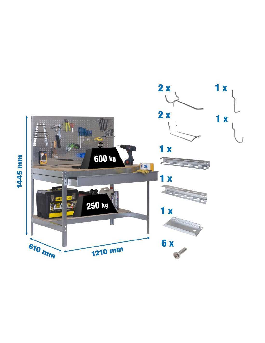 Especificaciones técnicas de la Mesa de Trabajo SIMONWORK Pack BT 2 con Cajón 1200 galva/mad+ 9 accesorios