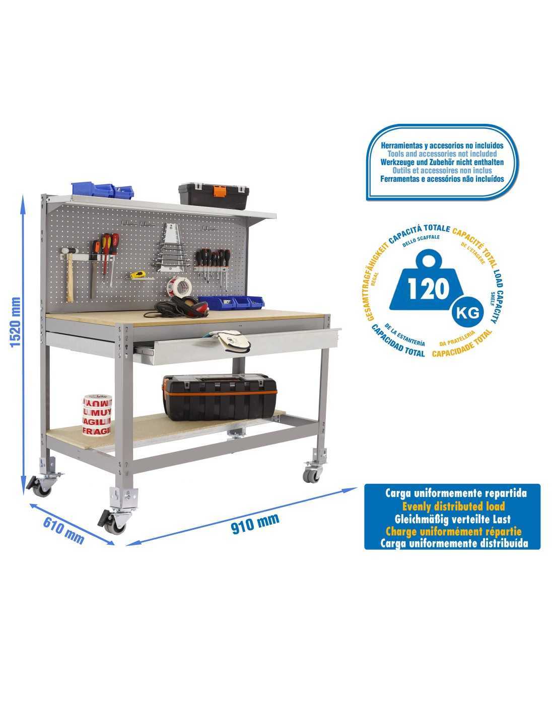 Con estructura metálica de alta resistencia y superficies amplias, esta mesa permite trabajar con total estabilidad, incluso con maquinaria, herramientas o componentes de peso. Ideal para talleres, garajes, almacenes o espacios técnicos.