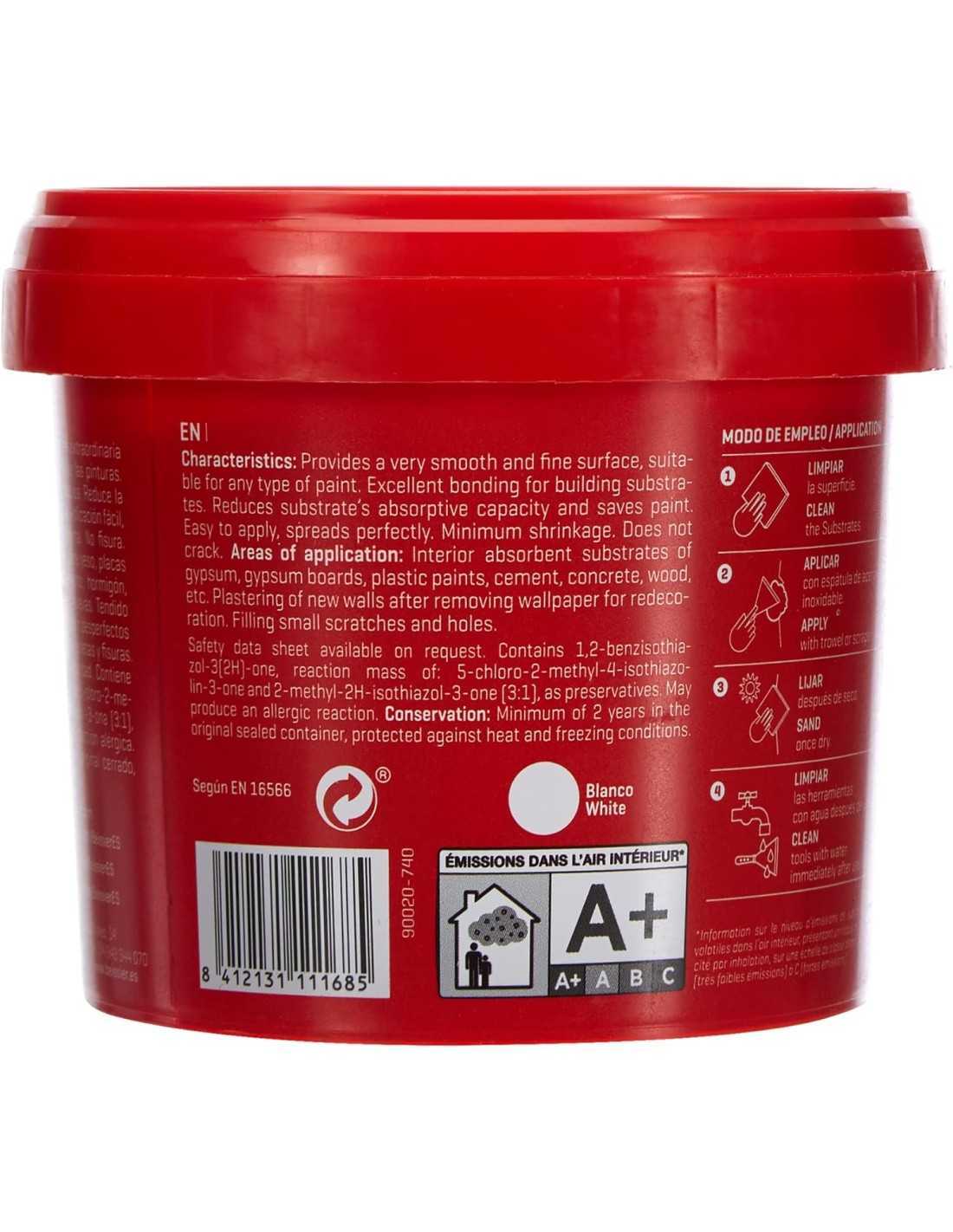 Este producto es especialmente útil para alisar paredes con imperfecciones, cubrir pequeñas grietas y agujeros, y crear una superficie uniforme y lisa. También es perfecto para reducir la absorción de pintura en paredes porosas, lo que permite ahorrar pintura y obtener un acabado más uniforme.