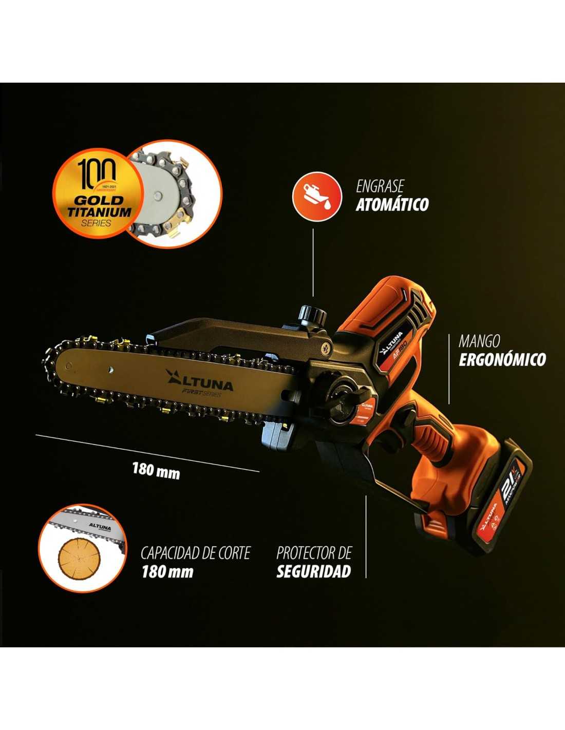- Cadena de Titanio Autoengrasable: Fabricada con materiales de alta resistencia, la cadena cuenta con un sistema de lubricación automática que optimiza el rendimiento del corte sin intervención manual constante.