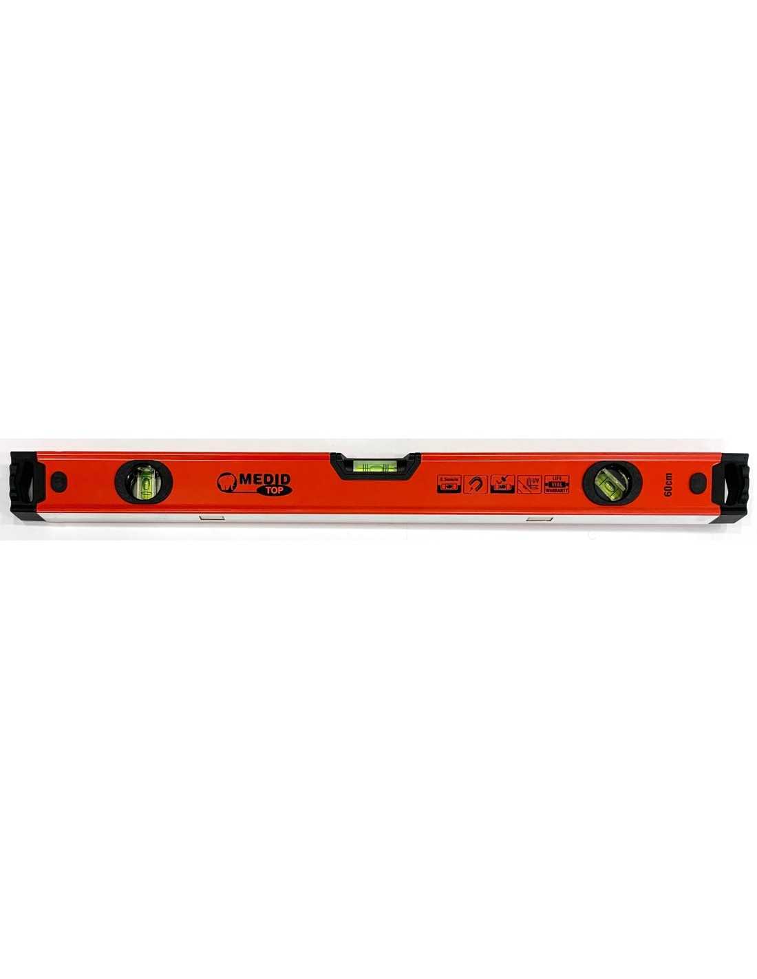 Nivel tubular de aluminio con 3 burbujas acrílicas de alta resistencia. Precisión: < 0.5 mm/m Perfil de Aluminio reforzado, con un filo continuo para marcaje. Base con fresado de precisión (hasta 120 cm) Sistema antideslizante para nivelación en muros. Topes de goma bimaterial antichoc. Versión magnética con imanes de alta potencia.3 burbujas Precisión <0.5 mm/m Perfil aluminio reforzado Topes de goma Disponible varios tamaños