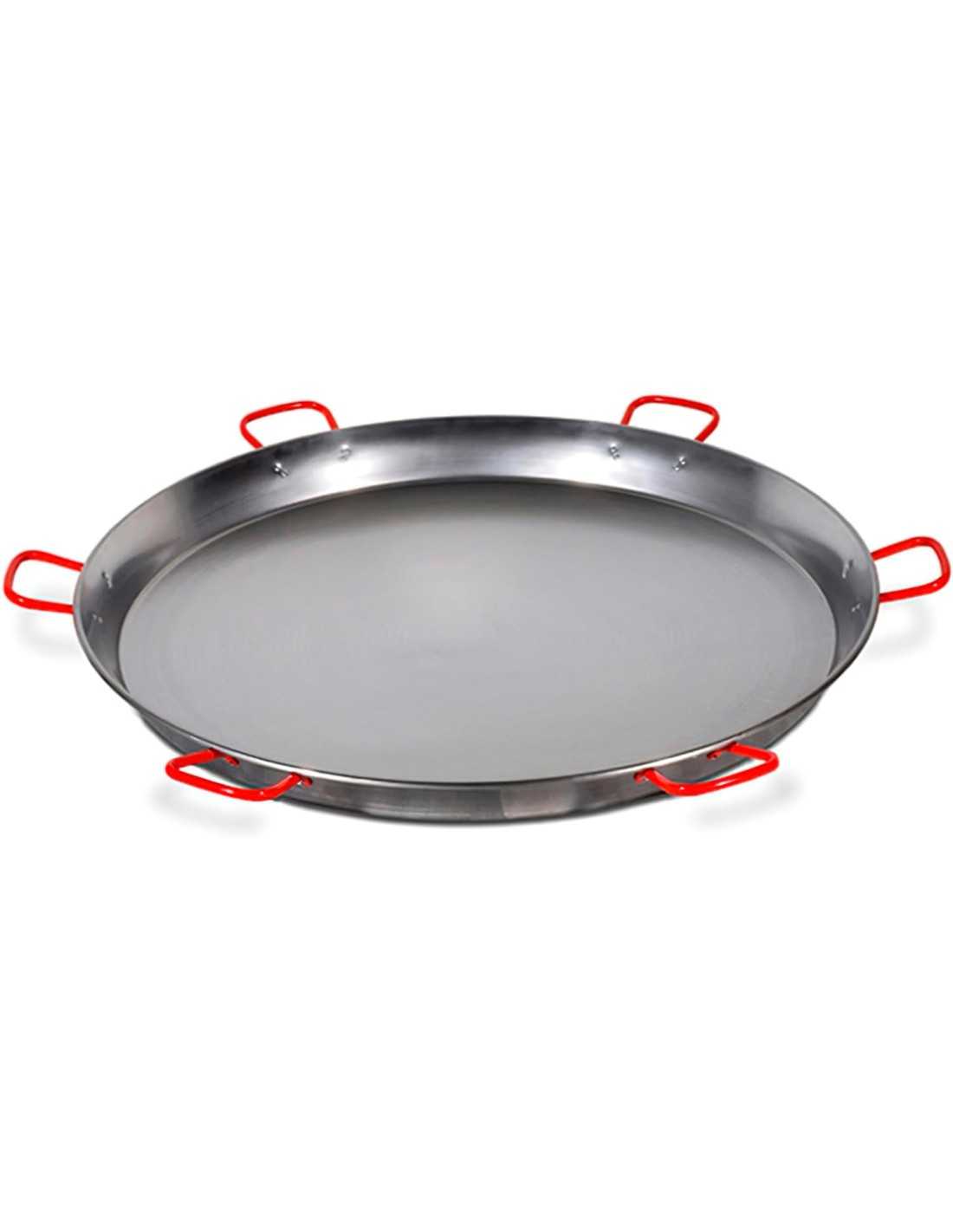 Fabricada en acero pulido de alta calidad, esta paellera garantiza una excelente conductividad térmica y durabilidad, lo cual es fundamental para el uso intensivo en entornos profesionales. El acero pulido, o acero aleado, es conocido por la forma en que desarrolla un sabor único con el uso (la "curación"), enriqueciendo el sabor de cada paella. A pesar de su enorme tamaño, presenta una profundidad adecuada para manejar hasta **51 litros** de contenido sin derrames. Aunque tradicionalmente se usa sobre fuego directo, su versatilidad sorprende: es apta para su uso en cocinas de inducción de gran superficie o placas lisas de inducción, abriendo un abanico de posibilidades en cocinas modernas. Para lograr la excelencia en la cocción y esa distribución de calor uniforme tan crucial, siempre recomendamos acompañar esta paellera con un paellero (quemador) de gas profesional adecuado.