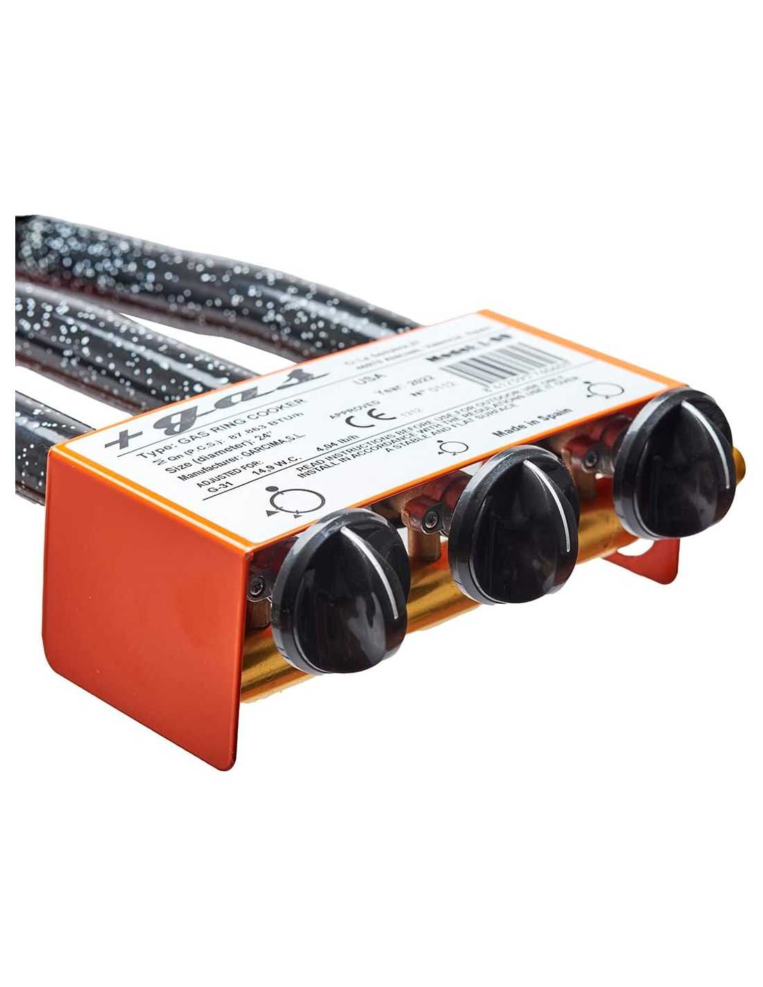 Incorpora un aro interior extra y una salida de gas doble en los aros internos, asegurando un **reparto uniforme del calor** en toda la base de la paellera, desde el centro hasta los bordes. Sus llaves de paso de gas mejoradas con control de mínimo permiten una gestión precisa de la llama, lo que facilita el proceso de cocción. El paellero Garcima L-60 es la elección perfecta, homologado para uso en exteriores y diseñado para resistir las condiciones más exigentes.