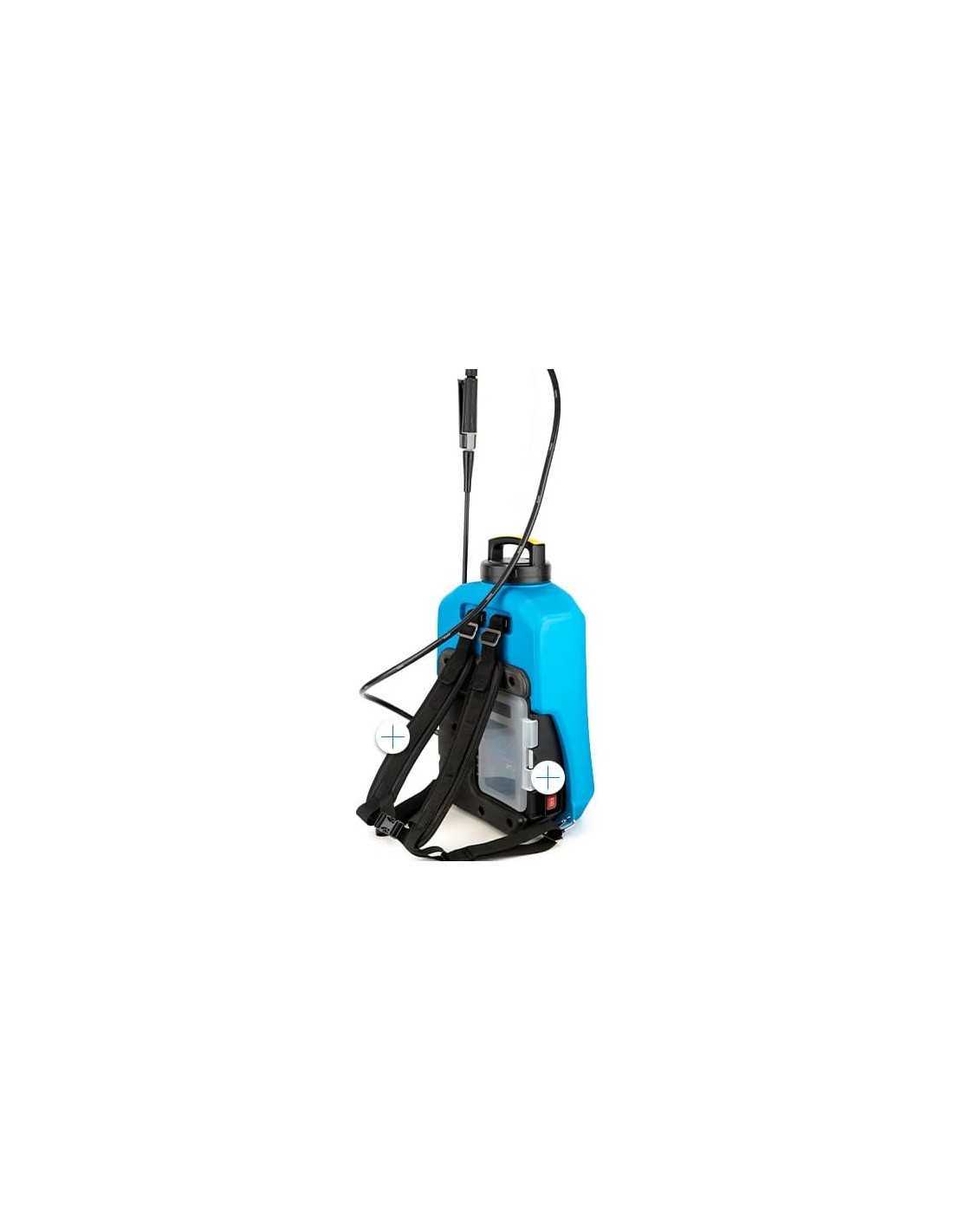 Incluye una lanza de fibra de vidrio, manguera reforzada, asa integrada y ergonómica, correas ajustables y acolchadas, y una amplia boca de llenado.