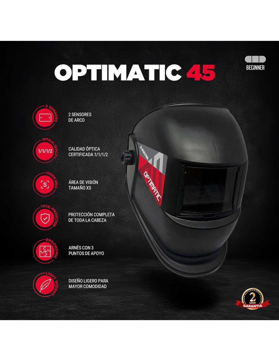 Con un rango de ajuste DIN 4/9-13 y un tiempo de reacción ultrarrápido de 1/25,000 segundos, protege tus ojos de la intensa luz del arco de soldadura. Su filtro óptico de alta calidad 1/1/1/2 asegura una visión nítida y sin distorsiones, mientras que su diseño ergonómico y ligero permite trabajar durante largas jornadas sin fatiga. Compatible con procesos MIG/MAG y TIG, la OPTIMATIC 45 es la elección perfecta para quienes buscan calidad y rendimiento.