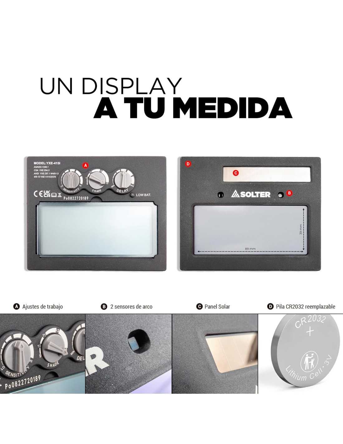- Oscurecimiento Automático DIN 4/9-13: Protección ocular avanzada con ajuste de sensibilidad.
