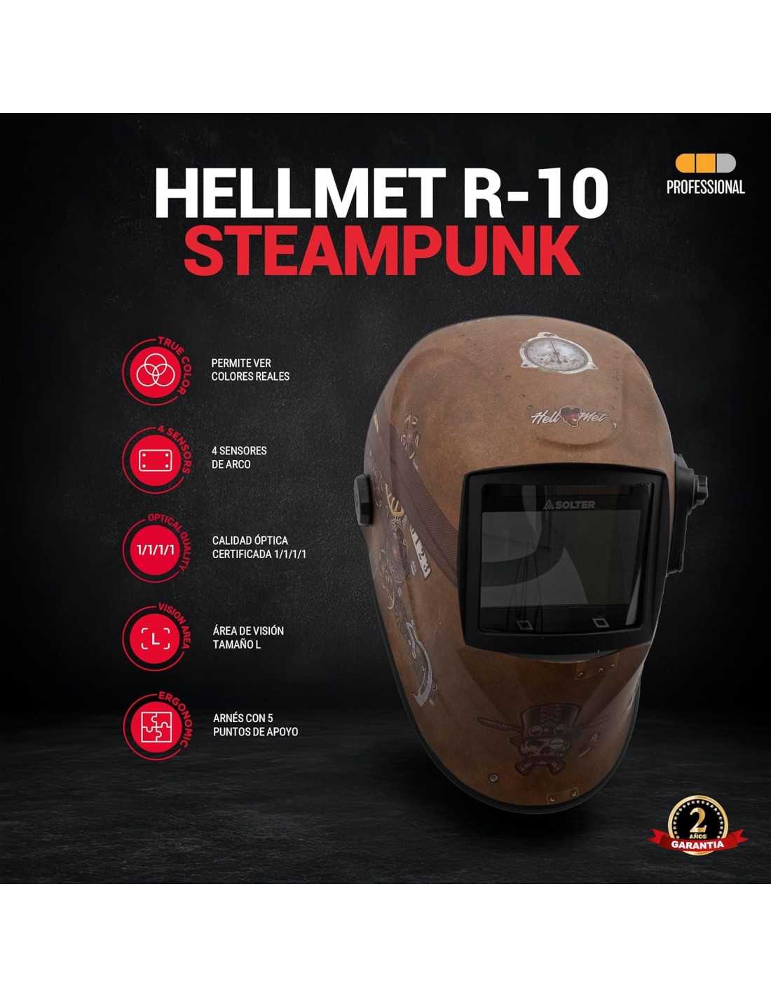 La Pantalla de Soldadura Automática SOLTER HELLMET R-10 STEAMPUNK es la herramienta definitiva para el soldador moderno que no sacrifica el estilo por la funcionalidad. Incorporando la avanzada **Tecnología True Color**, esta pantalla permite una visión nítida con colores reales y en 3D, lo que resulta en una precisión inigualable y una notable reducción de la fatiga ocular durante extensas jornadas de trabajo.