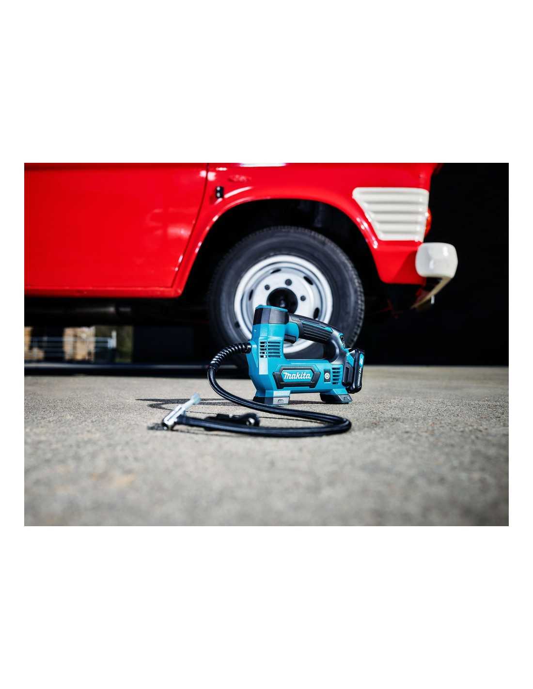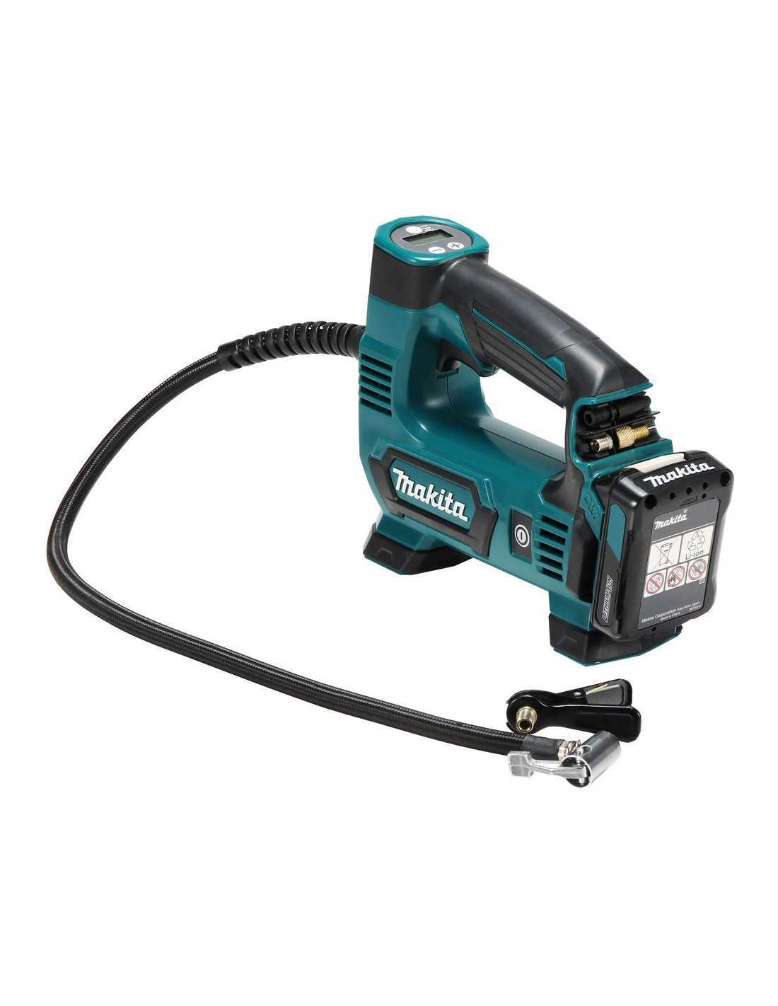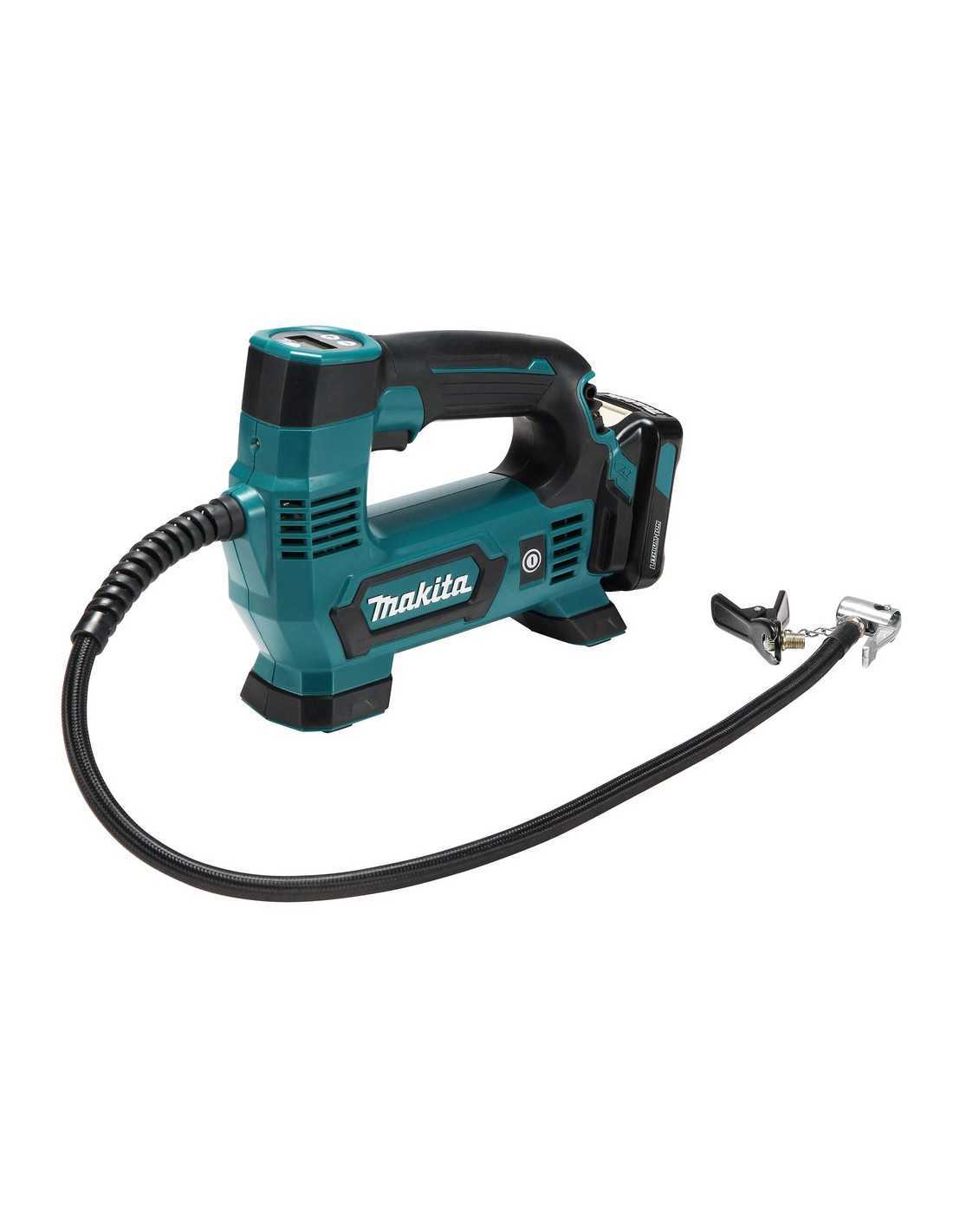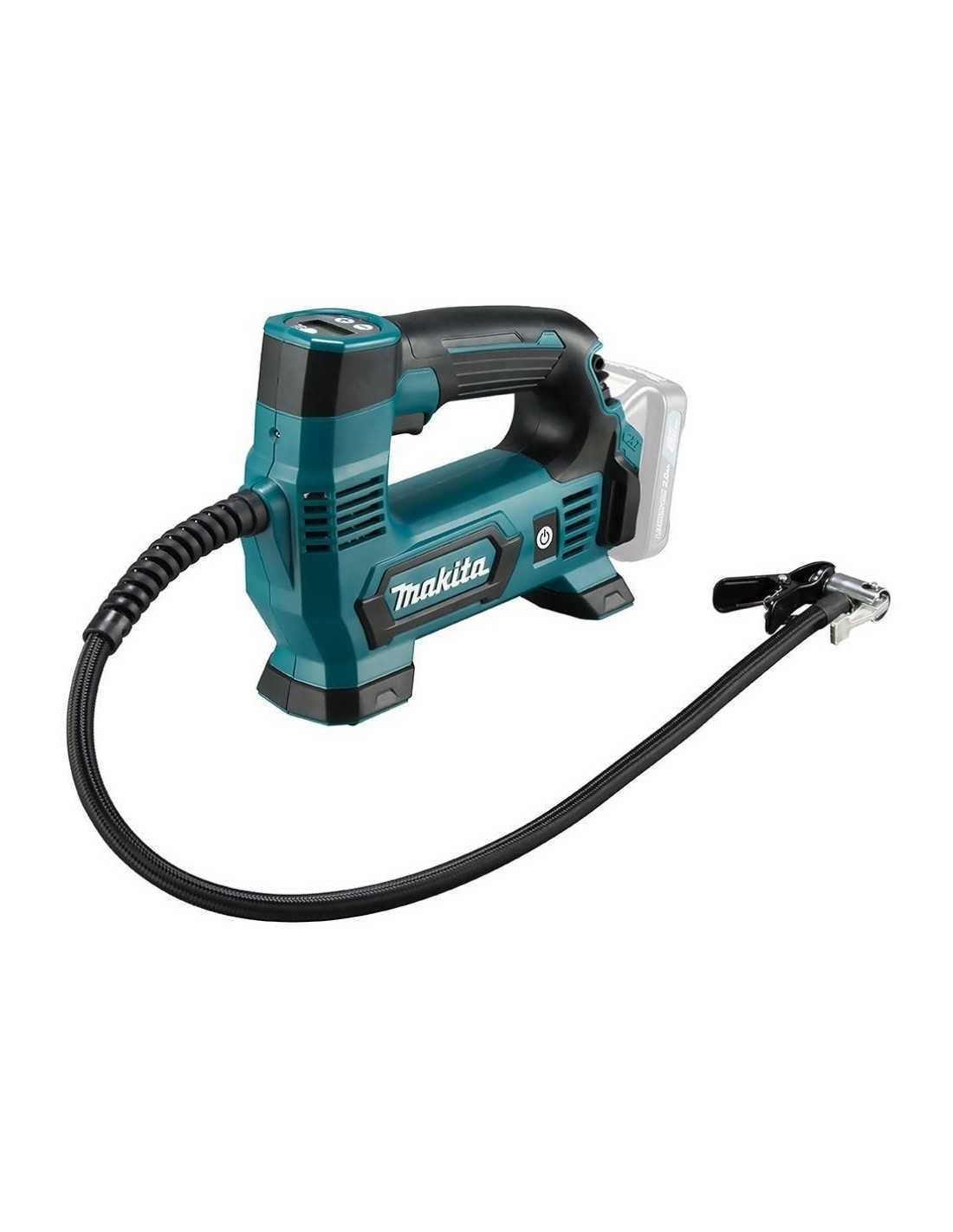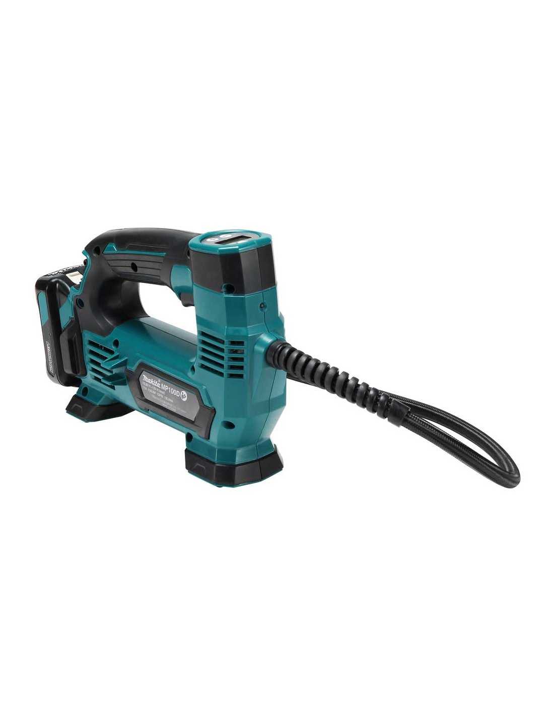 El Makita MP100DZ es un inflador inalámbrico compacto con una longitud total de 235 - 255 mm. Cuenta con una función de parada automática que detiene la inflación a la presión de aire deseada. Su interruptor principal evita el funcionamiento accidental y su interruptor de tipo gatillo proporciona una operación cómoda y fácil. Además, cuenta con una luz de trabajo LED para facilitar la operación en lugares oscuros y un manómetro digital con retroiluminación para una mayor visibilidad.
