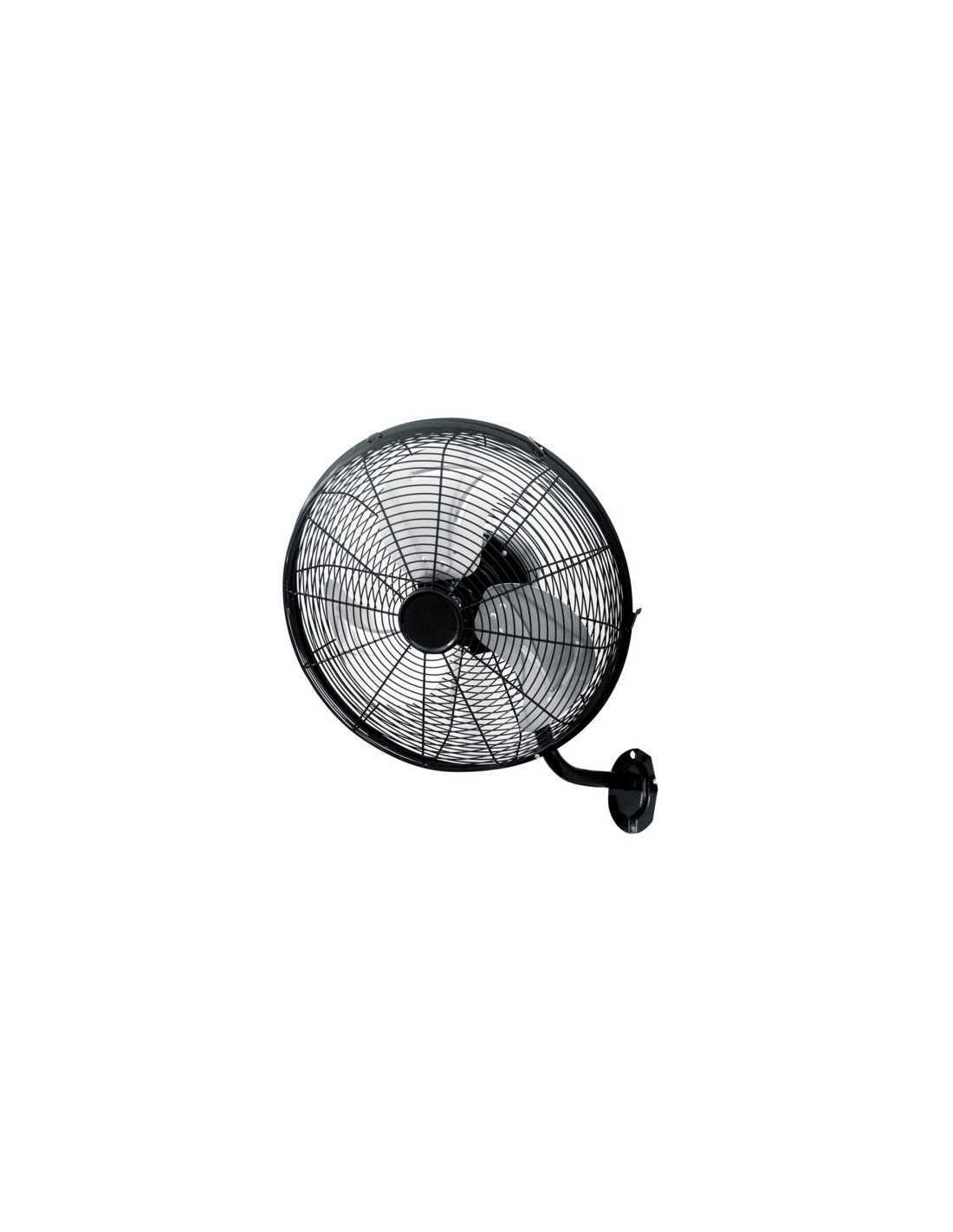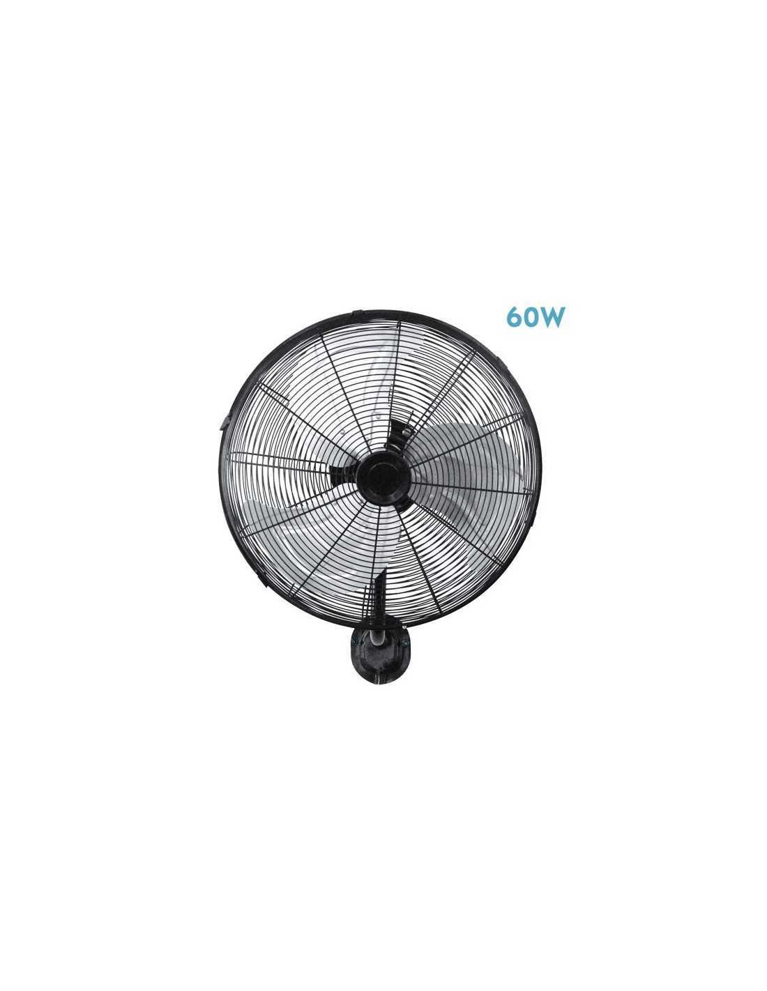 Ventilador de pared de la serie ARRECIFE realizado en metal y aluminio, de color Negro con tres aspas en color PLATA y tres velocidades. Motor AC. Con dos posiciones de cabezal, fijo y rotatorio, también oscilante, pudiendo redirigir el aire a la zona que desee. Tiene una potencia máxima de 60 watios y una medida de 57,5x40x54 centímetros. Disponible en 60w, 90w y 120w con sus respectivos tamaños.
