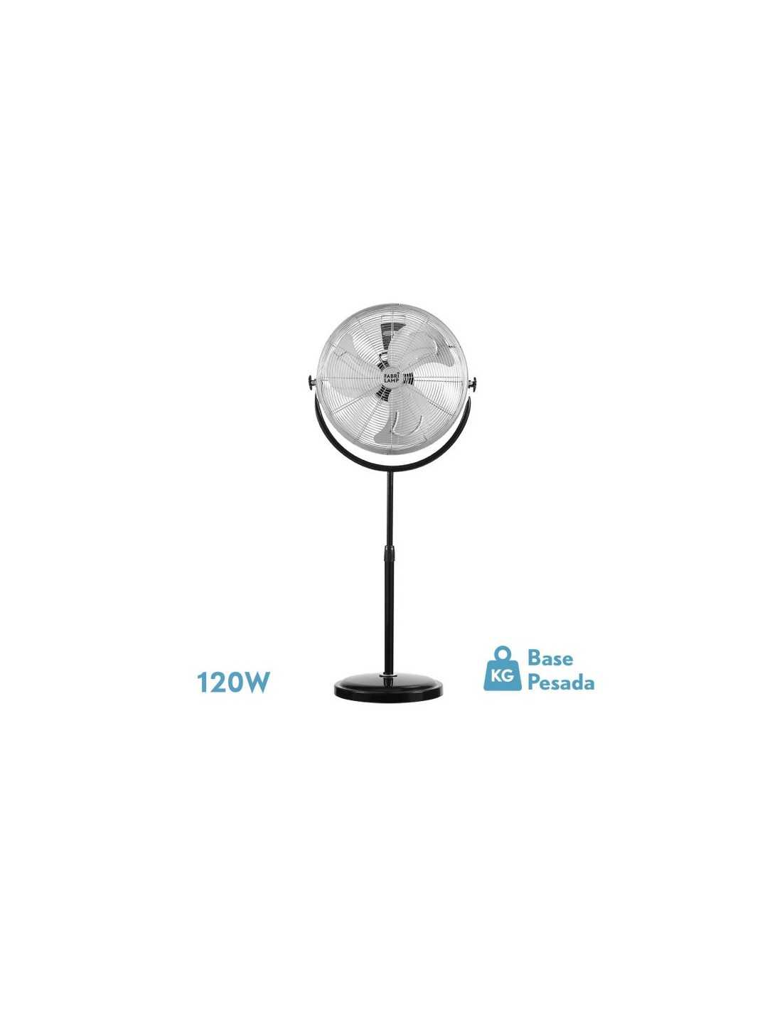 Ventilador de pie TRASCIAS realizado en metal, aluminio y policarbonato, de color Negro con tres aspas de color PLATA y tres velocidades. Motor AC. Cabezal orientable. Tiene una potencia de 120 watios. Presenta una medida regulable en altura de 120<,155X55X55 centímetros.