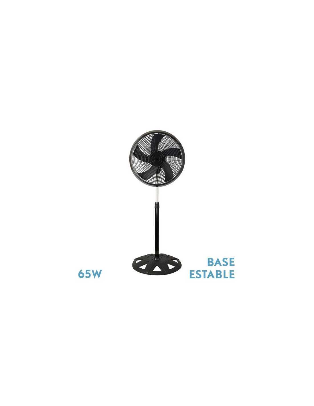 Ventilador de Pie de la serie AGUDO en color Negro con cinco aspas y tres velocidades. Realizado en metal y policarbonato. Motor AC. Tiene una potencia de 65 watios. Dos posiciones, fijo y rotatorio, también oscilante, pudiéndose redirigir el aire a la zona deseada y ampliando la zona de ventilación dependiendo de las necesidades de la estancia. De diseño sencillo y fácil manejo, dispone de una base redonda y ergonómica para una mayor estabilidad. Presenta unas dimensiones, con altura regulable, de 104<,130x50x50 centímetros.