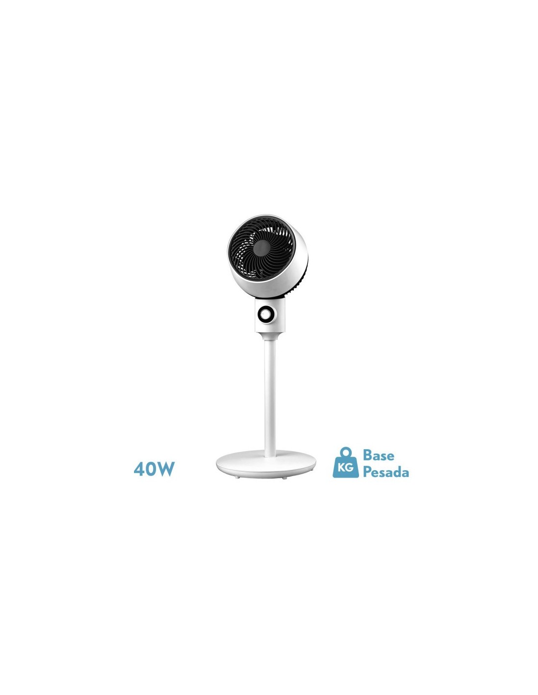 Ventilador de Pie de la serie OZONO en color Blanco/Negro con tres aspas y tres velocidades. Realizado en ABS. Motor AC. Tiene una potencia de 40 watios. Dos posiciones, fijo y rotatorio, también oscilante, pudiéndose redirigir el aire a la zona deseada y ampliando la zona de ventilación dependiendo de las necesidades de la estancia. De diseño moderno y original, de fácil manejo, dispone de una base redonda que le aporta estabilidad. Presenta unas dimensiones de 86x34x34 centímetros con una cabeza de ventilador de 23,5 centímetros de diámetro.