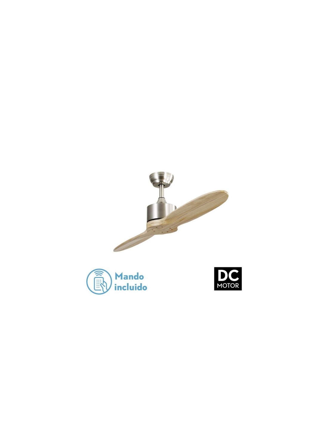 Ventilador LESTE sin luz incorporada, realizado en metal y madera, en color NIQUEL con dos aspas de color Haya. Motor DC. Tiene cinco velocidades ajustables. Su medida es de 35/47X132X132 centímetros, incluye DOS MEDIDAS DE TIJA con lo que puede adaptarse a techos de distintas alturas. Control de aire verano o invierno. Mando a distancia INCLUIDO con TEMPORIZADOR 1/4/8 H. Modelo también disponible en Cuero-Roble.
