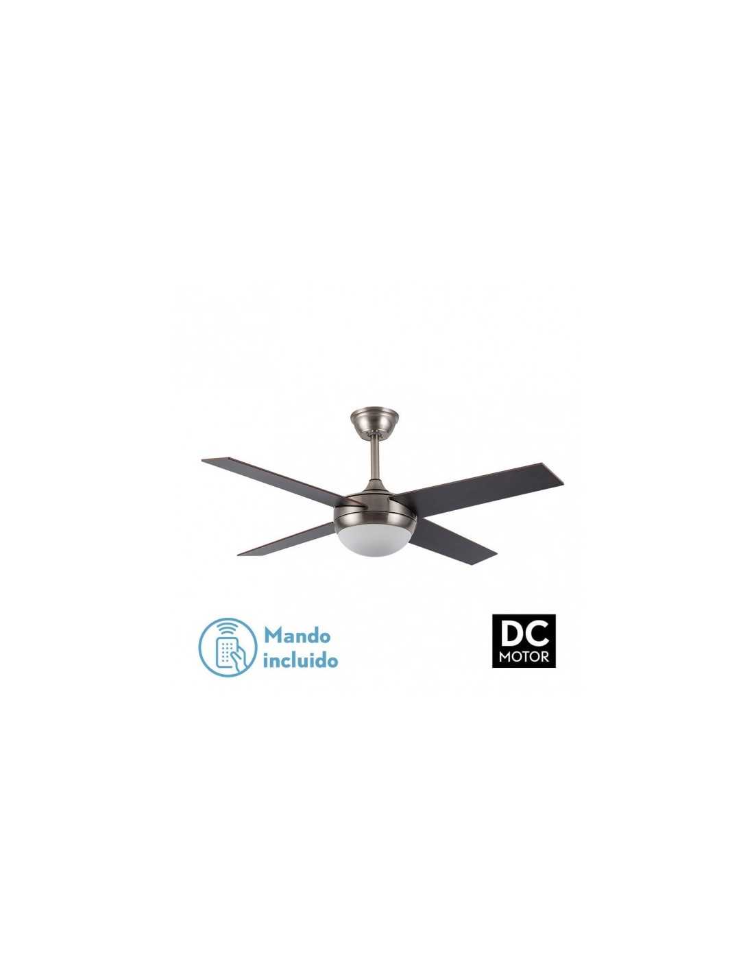 Ventilador DC serie CIRO de color NÍQUEL con 4 aspas REVERSIBLES color WENGUÉ/Haya. Realizado de metal, MDF y cristal. Tiene una medida de 35/45x116,8x116,8 centímetros. Posee 2 portalámparas E27 (bombillas no incluidas). Contiene control remoto con 6 velocidades diferentes, modo de verano/invierno y temporizador de 1 hasta 8 horas. Incluye dos tijas de 15 y 25 centímetros. Modelo también disponible en color Blanco-Blanco/Haya, Marrón rústico-Nogal, Níquel-Haya/Plata y Cuero-Nogal.