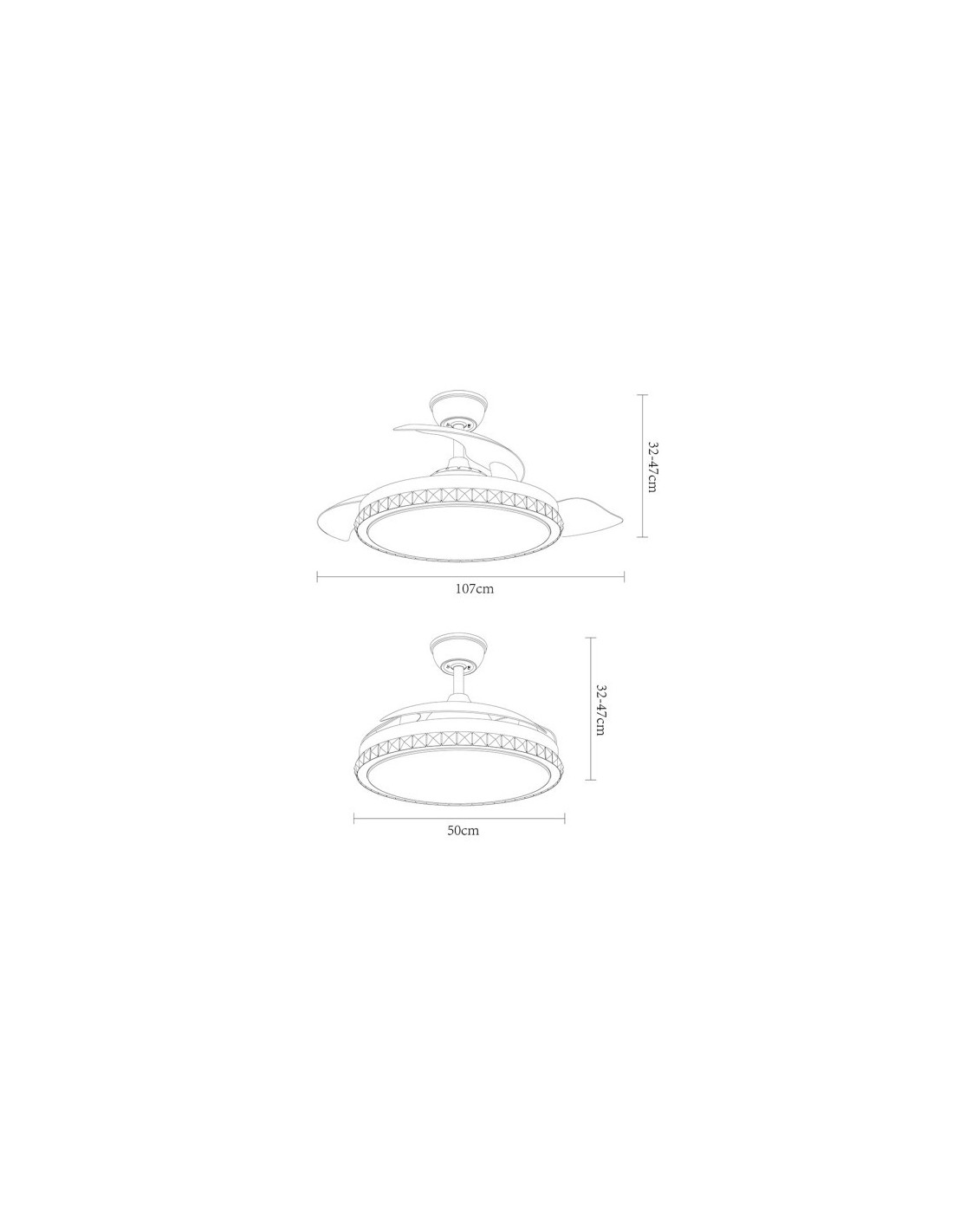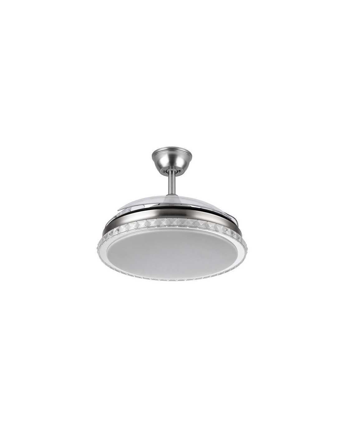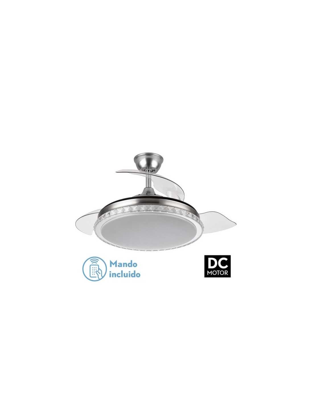 Ventilador DC serie BILIKU realizado en metal, policarbonato y ABS, en color NÍQUEL con tres aspas DESPLEGABLES transparentes de ABS muy resistentes. Tiene seis velocidades ajustables. Tecnología LED integrada con una potencia de 72W, con 3 TEMPERATURAS DE LUZ (3000-4000-6000K) y 6120 lúmenes. Control de aire verano o invierno. Su medida es de 32/47X50 centímetros con las aspas plegadas y de 32/47X108 centímetros con las aspas desplegadas. Incluye dos tijas de 10 y 25 centímetros. Mando a distancia INCLUIDO con MEMORIA DE COLOR incorporada y TEMPORIZADOR 1/2/4 H.