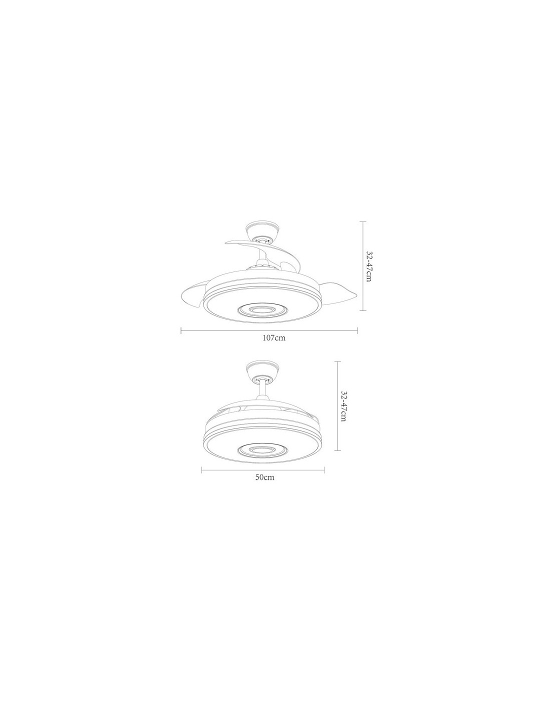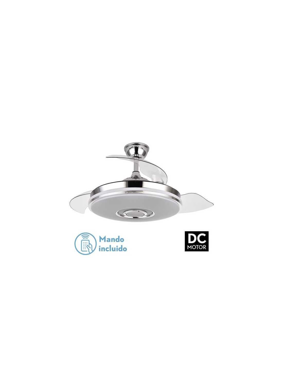 Ventilador NOTO de color CROMO con tres aspas DESPLEGABLES de ABS muy resistentes de color transparente y seis velocidades. Motor DC .Realizado en metal, policarbonato y ABS. Tecnología LED integrada con una potencia de luz de 72 watios, 6120 lúmenes y RGB. Con memoria de color y 3 TEMPEARTURAS DE LUZ( 3000, 4000, 6000 k). Mando a distancia INCLUÍDO con temporizador de 1/2/4 horas. Con ALTAVOZ INCORPORADO y RECEPCIÓN BLUETOOTH. APP (ilink) para su funcionamiento a través de dispositivos móviles. Su medida es de 32/47x50 centímetros con las aspas plegadas y de 32/47x108 centímetros con las aspas desplegadas. Tiene dos tijas de 10 y 25 centímetros.
