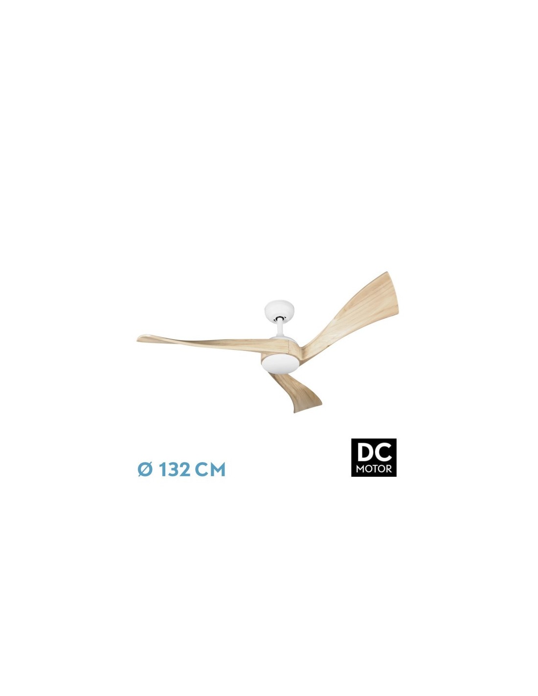 Ventilador DC de la serie JANUBI en color Blanco y tres aspas en color Haya. Realizado en metal, madera y cristal. Motor DC con seis velocidades. Tiene TECNOLOGÍA LED integrada con 22 watios de potencia , 2350 lúmenes y TRES TEMPERATURAS SELECCIONABLES DE LUZ 3000-4000-6000k (cálida, blanco natural y blanco frío). Sus dimensiones son 40,5/50,5x132x132 centímetros, con dos medidas de tijas para instalar a diferentes alturas. Trae MANDO A DISTANCIA incluido con REGULADOR DE INTENSIDAD, MEMORIA DE COLOR y TEMPORIZADOR para poder seleccionar que el ventilador se apague automáticamente desde los 30 minutos hasta las 2 horas. Control de aire verano/invierno. Disponible en esta serie en color blanco/haya, negro/roble y níquel/haya.