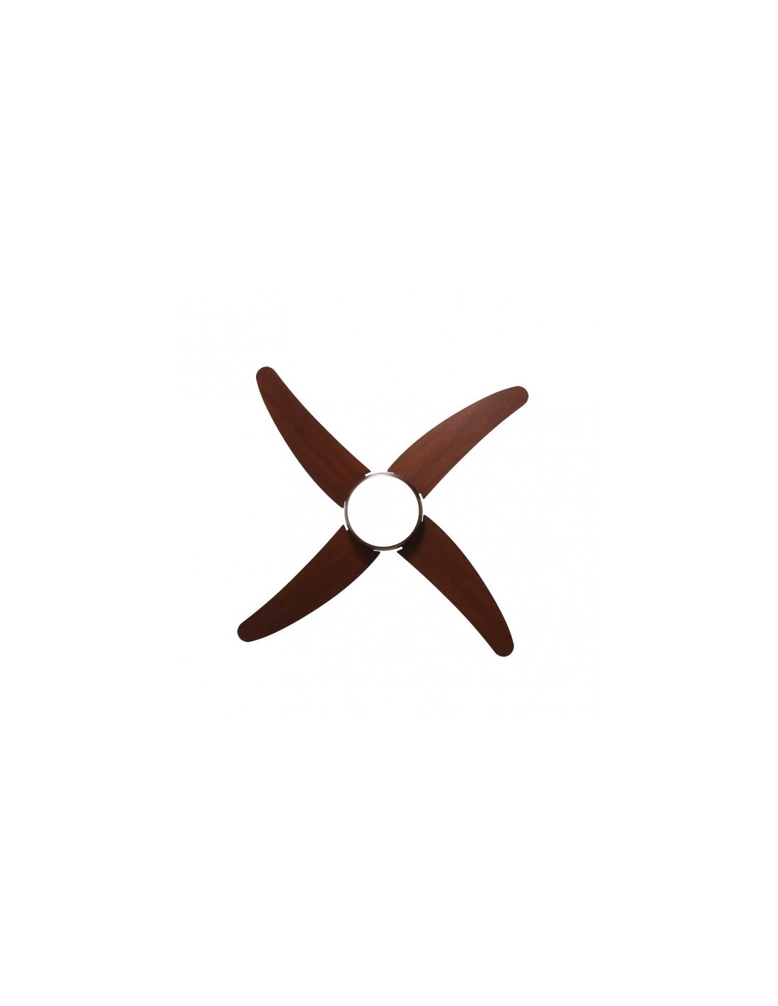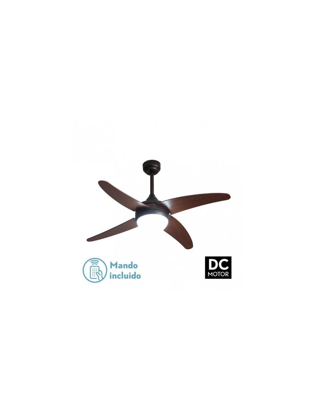 Ventilador KLOD color RUSTICO, con 4 aspas color NOGAL. Motor DC. Realizado en metal, MDF y cristal. Posee seis velocidades con control de aire para verano o invierno. Tiene 2 portalámparas E27. Mando a distancia y TEMPORIZADOR incluido. Su dimensión es de 37,5/50x117x117 centímetros de diámetro. Viene con dos medidas de tijas para colocar a diferentes alturas. Bombillas no incluidas. Modelo también disponible en color Blanco, Cuero/Cerezo y Níquel/Plata.