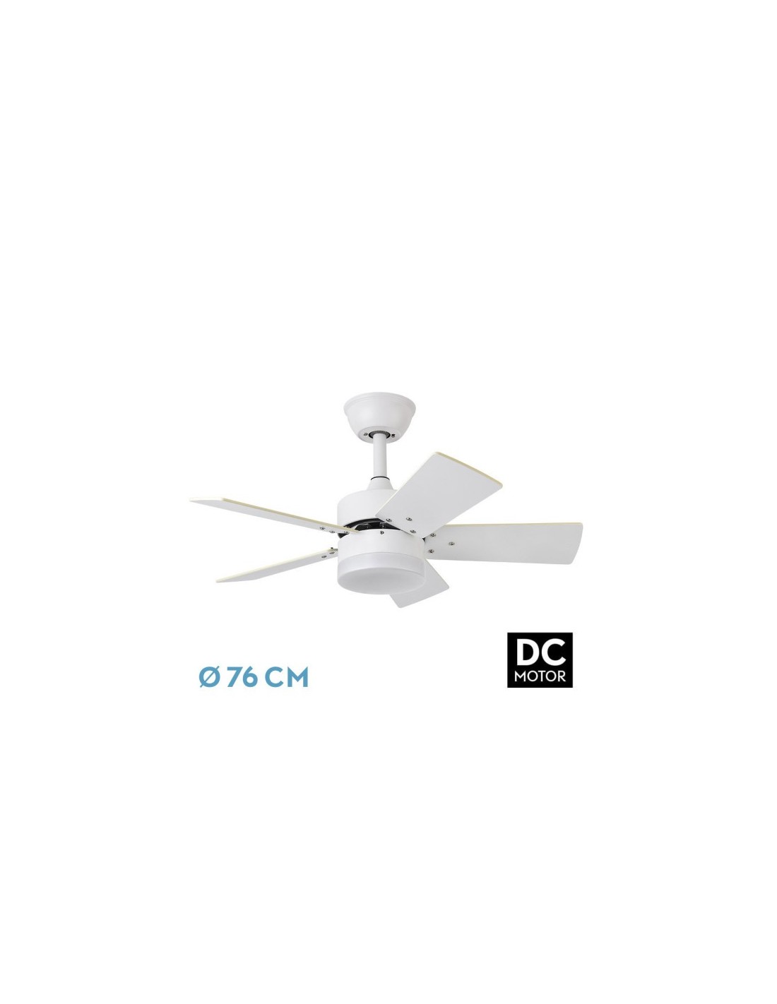 Ventilador DC serie MARTA de color Blanco con cinco aspas REVERSIBLES en color Blanco/Haya y seis velocidades. Sus dimensiones son 41x76x76 centímetros. Posee Tecnología LED integrado con una potencia de 36 W, 3060 lúmenes y luz seleccionable en 3 posiciones (3000k color blanca cálida, 4000k color blanca neutra, y 6000k color blanca fría), además de memoria de color. Tiene control remoto INCLUIDO con la opción verano/invierno y la opción de temporizador de 1 hasta 4 horas. El cuerpo del ventilador es de metal y policarbonato, y las aspas de MDF. Disponible también en color Níquel-Plata/Haya y en Cuero-Cerezo/Nogal.
