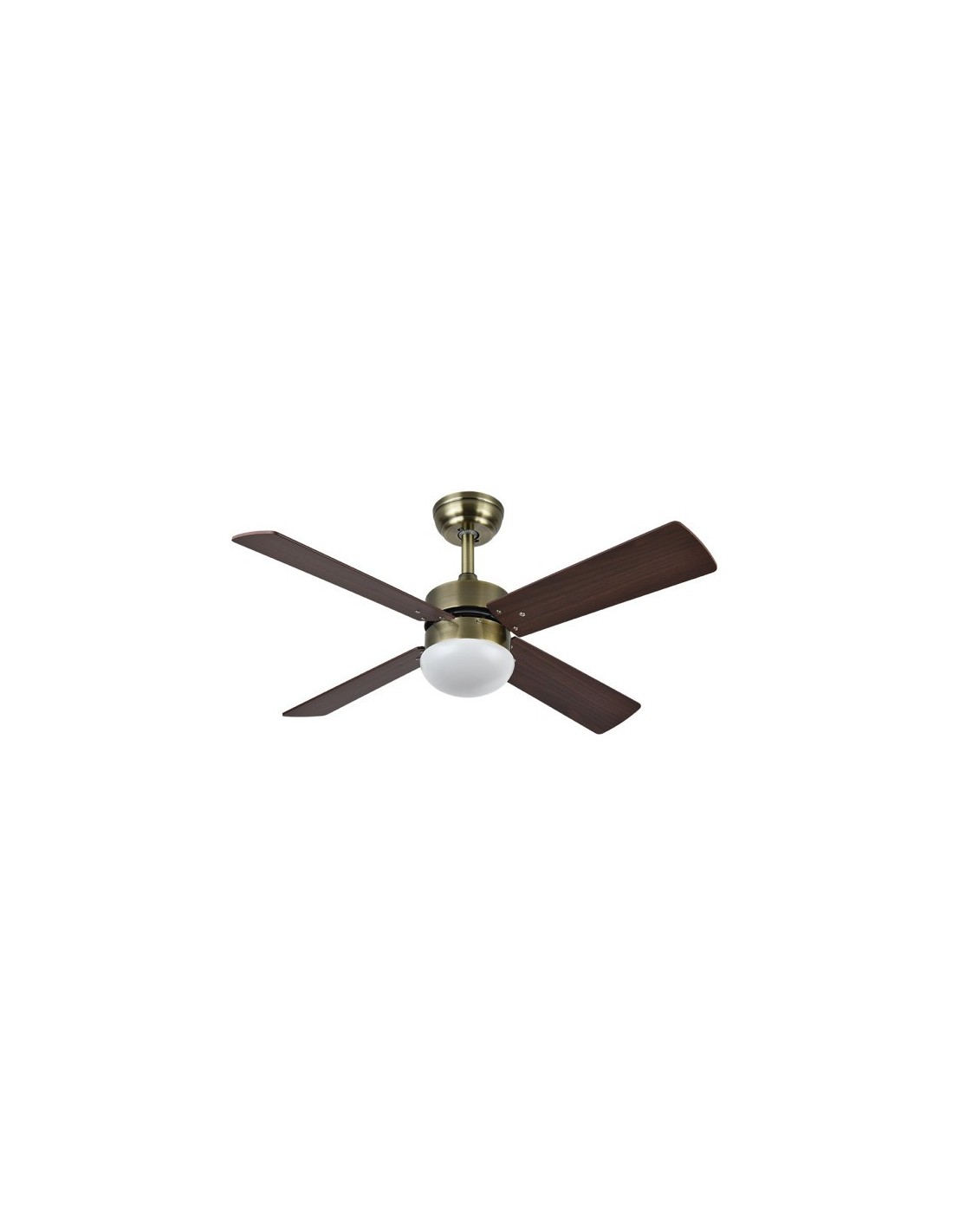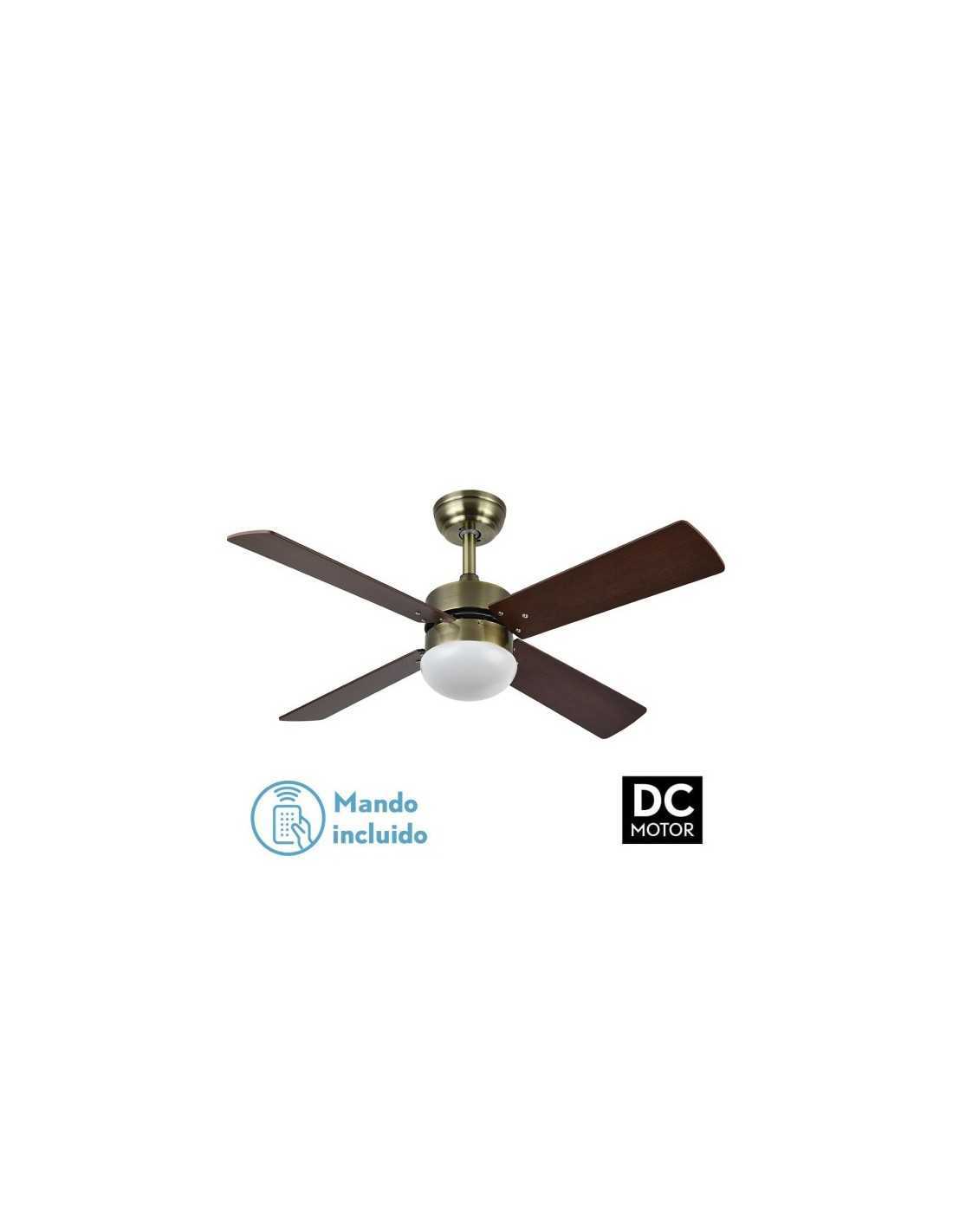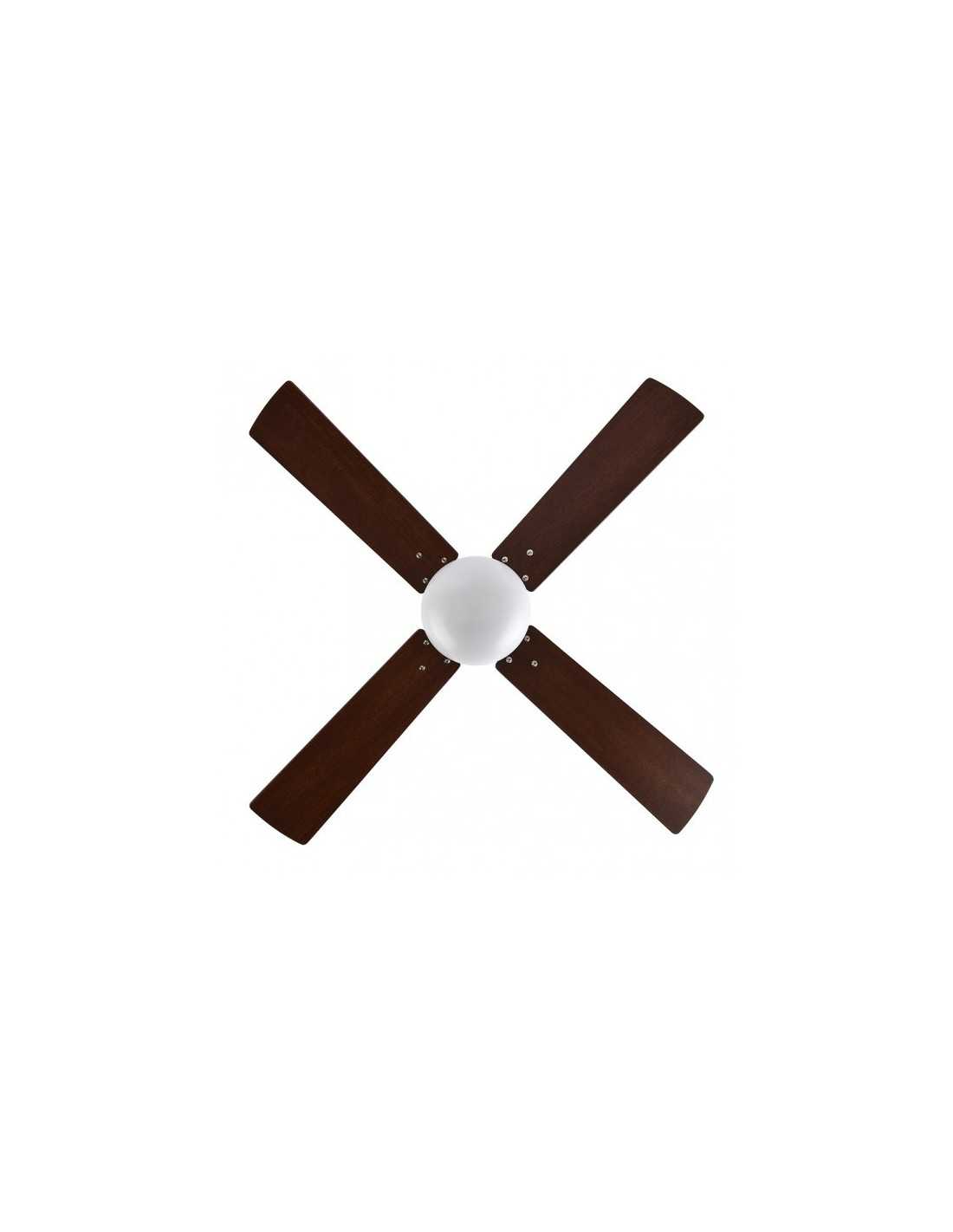 Ventilador DC serie SOFIA realizado en metal y policarbonato con las aspas en MDF. De color CUERO con cuatro aspas REVERSIBLES de color CEREZO/NOGAL y seis velocidades. Tiene una medida de 40x107x107 centímetros. Viene con dos portalámpara E27. Bombillas NO incluidas. Control de aire para verano o invierno. Mando a distancia INCLUIDO con temporizador de 1 hasta 4 horas. Modelo también disponible en color Níquel-Plata/Haya y en Blanco-Blanco/Haya.
