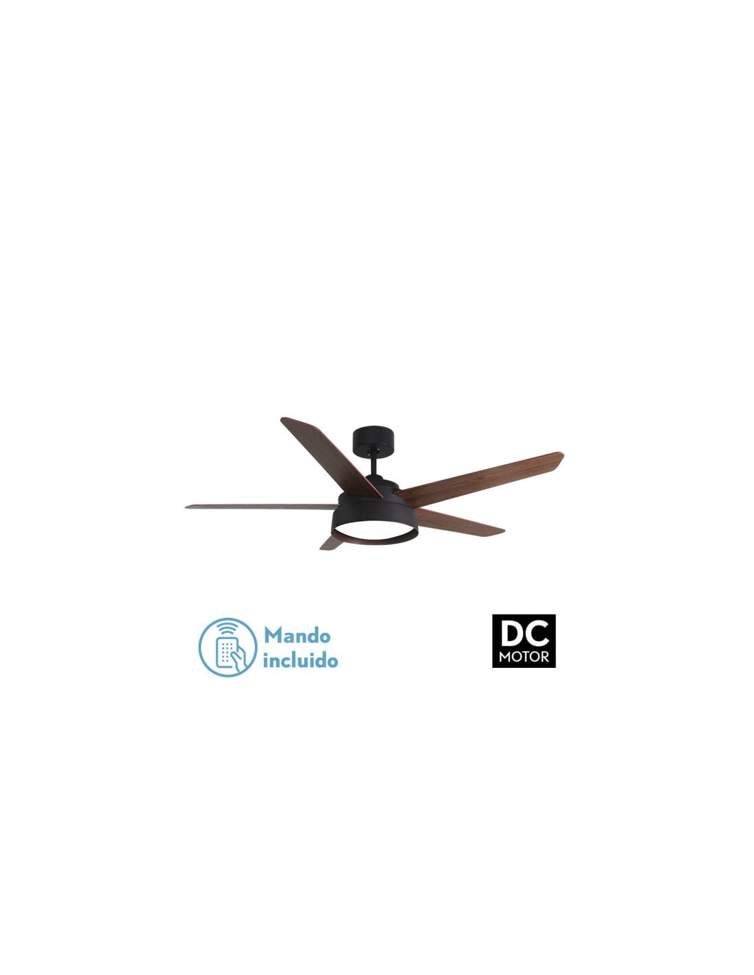 Ventilador de la serie LEBECHE realizado en metal, MDF y cristal, en color MARRON con CINCO aspas REVERSIBLES de color NOGAL/ROBLE. Tiene seis velocidades ajustables, con motor DC. Tecnología LED incorporada con una potencia de 25 watios, 2495 lúmenes y 3 TEMPERATURAS SELECCIONABLES DE LUZ( 3000-4000-6000K). Su medida es de 40/55x132x132 centímetros, viene con dos medidas de Tija lo que permite adaptarlo para distintas alturas de techo. Control de aire verano o invierno. Mando a distancia INCLUIDO con MEMORIA DE COLOR incorporada y TEMPORIZADOR 1/4/8 H. Modelo también disponible en Verde-Blanco/Haya, Blanco-Blanco/Haya y Gris-Blanco/Haya.