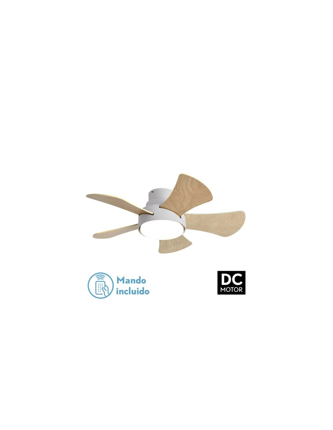 Ventilador DC de la serie GREGARIO de color Blanco con cinco aspas REVERSIBLES en color Blanco/Haya y seis velocidades. Sus dimensiones de 22x82x82 centímetros. Posee Tecnología LED integrado con una potencia de 25 W, 2495 lúmenes y luz seleccionable en 3 posiciones (3000k color blanca cálida, 4000k color blanca neutra, y 6000k color blanca fría), además de memoria de color. Tiene control remoto INCLUIDO con la opción verano/invierno y la opción de temporizador de 1 hasta 8 horas. El cuerpo del ventilador es de metal y cristal, y las aspas de MDF. Disponible también en color Verde-Blanco/Haya y en Gris-Blanco/Haya