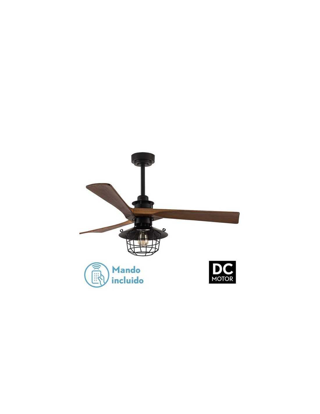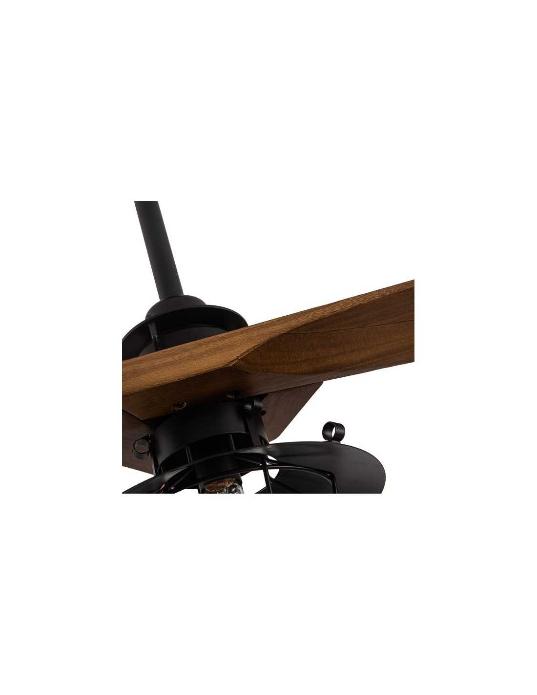 Ventilador VULTURNO realizado en metal y madera de color Negro con 3 aspas en ROBLE OSCURO y 6 velocidades. Motor DC. De diseño muy original, con una rejilla que protege su bombilla, lo hace idóneo para ambientes rústicos y decoraciones industriales. También viene con tapa incluida para funcionar como Ventilador CON LUZ O Ventilador SIN LUZ. Posee un portalámparas E27. Bombilla no incluida. Aconsejable completar con una bonita bombilla decorativa como la de las referencias 141301181 y 141301186 para preservar su estética. Tiene una medida de 53/65,5x132x132 centímetros, con DOS MEDIDAS DE TIJA (12,5 y 25 cm) para colocar a distintas alturas. Viene con mando a distancia INCLUIDO Y TEMPORIZADOR 1/2/4H.