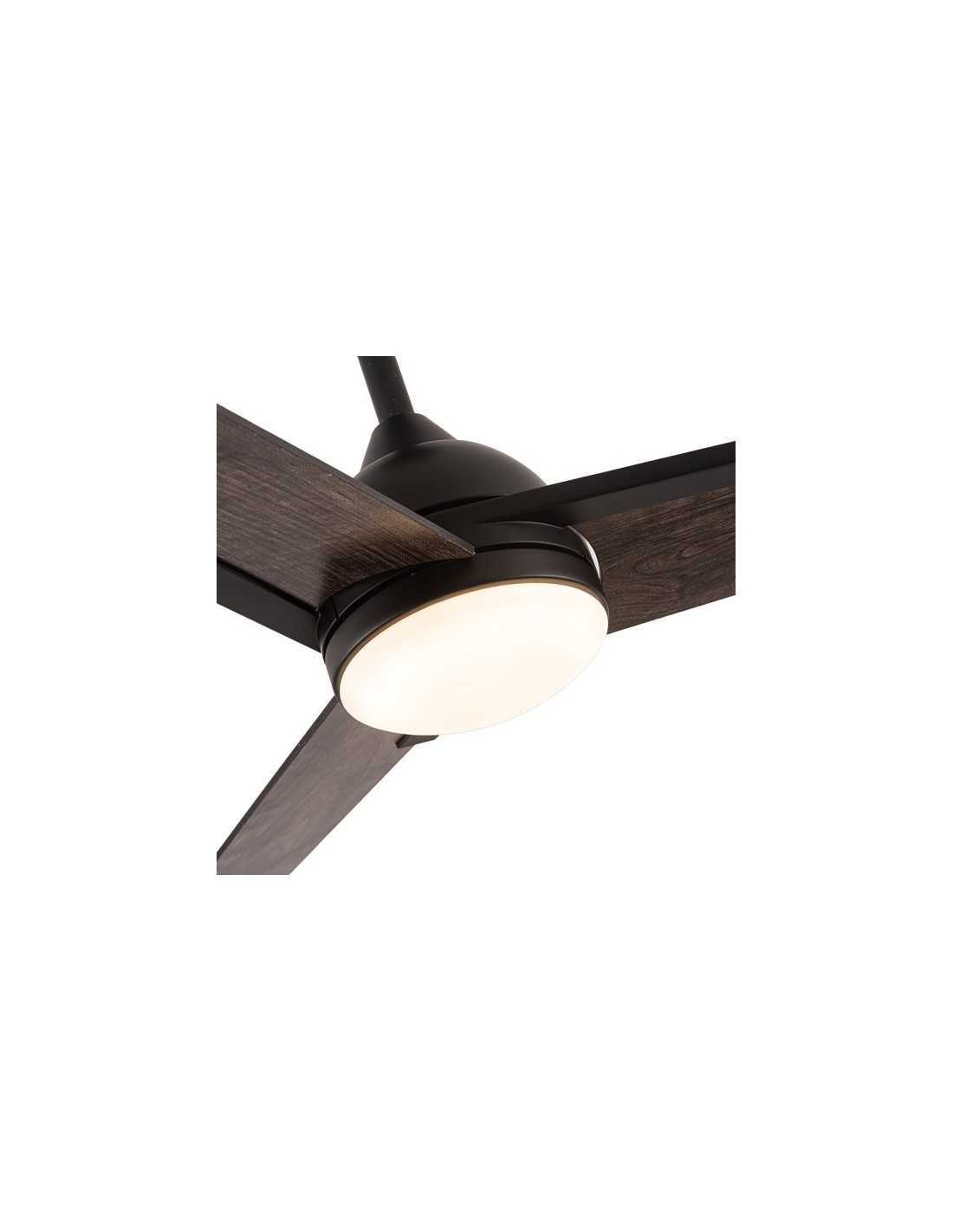Ventilador de la serie ARGESTES realizado en metal, MDF y cristal, en color Negro con tres aspas de color madera Gris. Tiene 6 velocidades ajustables. Motor DC, con Tecnología LED INTEGRADA con una potencia de 22 watios, con 3 TEMPERATURAS DE LUZ SELECCIONABLES( 3000-4000-6000K) y 2180 lúmenes. Su medida es de 35,5/48X132X132 centímetros, viene con dos medidas de Tija lo que permite adaptarlo para distintas alturas de techo. Control de aire verano o invierno. Mando a distancia INCLUIDO con MEMORIA DE COLOR incorporada y TEMPORIZADOR 1/2/4 H. Modelo también disponible en níquel/blanco.