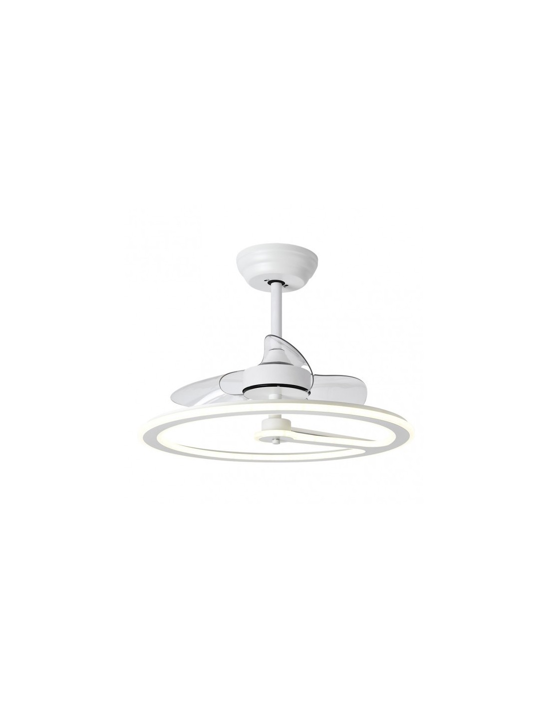 Ventilador de la serie CHOM color Blanco, con tres aspas transparentes y 6 velocidades. Motor DC. Realizado en metal, ABS y policarbonato. De diseño muy moderno y original. Tecnología LED integrada con 110 watios de potencia , 9350 lúmenes y con 3 colores de luz (3000ºk-4000ºk-6000ºk). Incluye MANDO A DISTANCIA, con MEMORIA DE COLOR incorporada y TEMPORIZADOR 1/2/4 H. Sus dimensiones son 46/66x62x62 centímetros, con dos medidas de tijas para diferentes alturas (20cm y 40 cm). En esta serie podemos encontrarlos disponibles en color negro y blanco.