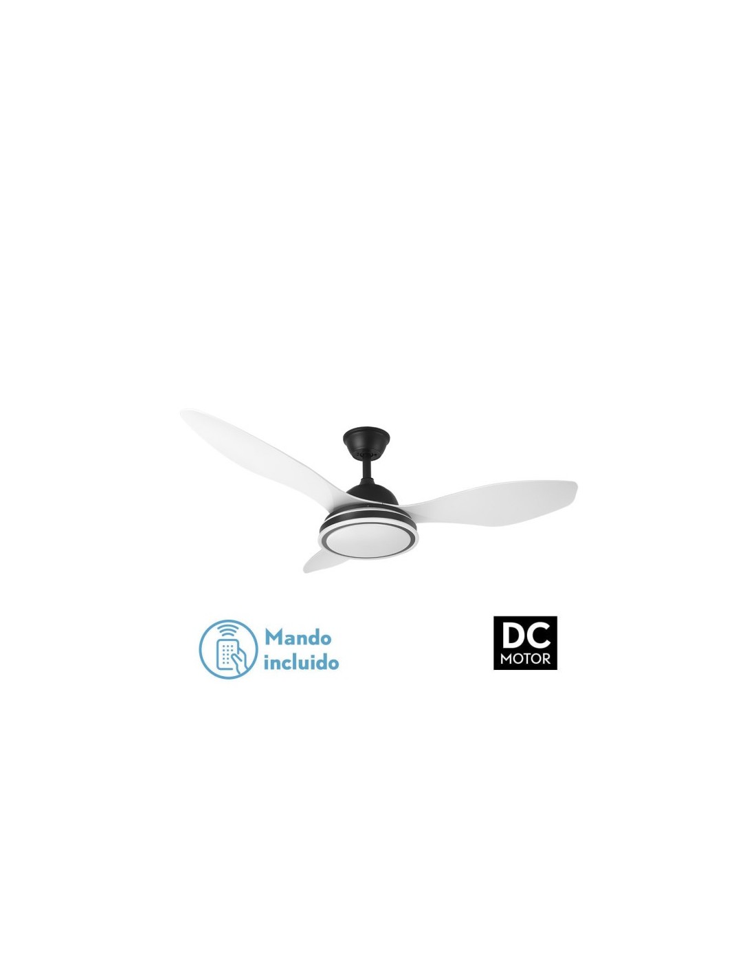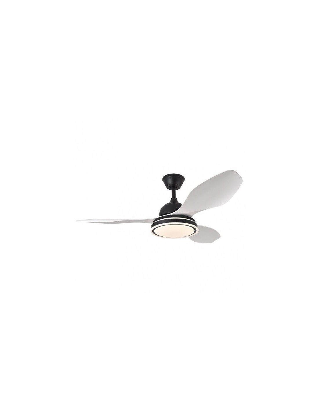 Ventilador de la serie DATOO color Negro, con tres aspas de color Blanco y 6 velocidades. Motor DC. Realizado en metal, ABS y policarbonato. De diseño moderno y elegante. Tecnología LED integrada con 48 watios de potencia , 4080 lúmenes y con 3 colores de luz (3000ºk-4000ºk-6000ºk). Incluye MANDO A DISTANCIA, con MEMORIA DE COLOR incorporada y TEMPORIZADOR 1/2/4 H. Sus dimensiones son 33/48x122x122 centímetros, con dos medidas de tijas para diferentes alturas (10cm y 25 cm). En esta serie podemos encontrarlos disponibles en color negro/blanco y blanco.