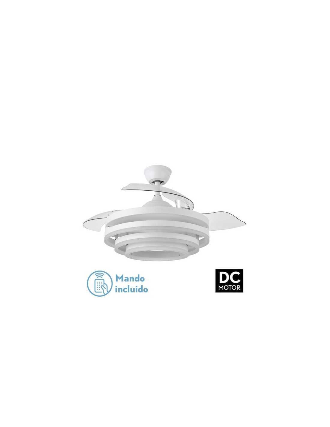 Ventilador DC de la serie KAI realizado en metal, policarbonato y ABS, en color Blanco con tres aspas DESPLEGABLES de ABS transparentes muy resistentes. Un diseño exclusivo y diferente que le aportan los tres aros de luz que forman su estructura, pudiendo inclinarlas creando diferentes composiciones de colores. Tiene seis velocidades ajustables. Tecnología LED integrada con una potencia de 72W, con 3 TEMPERATURAS DE LUZ (3000-4000-6000K) y 6120 lúmenes. Control de aire verano o invierno. Su medida es de 43/58X50 centímetros con las aspas plegadas y de 43/58X107 centímetros con las aspas desplegadas. Incluye dos tijas de 10 y 25 centímetros, para colocar a diferentes alturas. Mando a distancia INCLUIDO con MEMORIA DE COLOR incorporada y TEMPORIZADOR 1/2/4 H. Modelo también disponible en color negro.