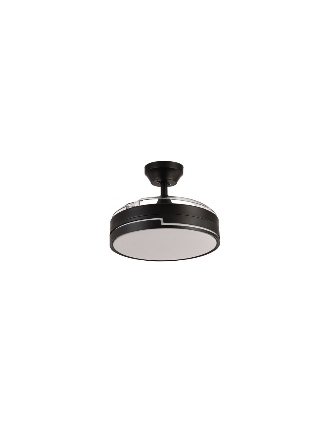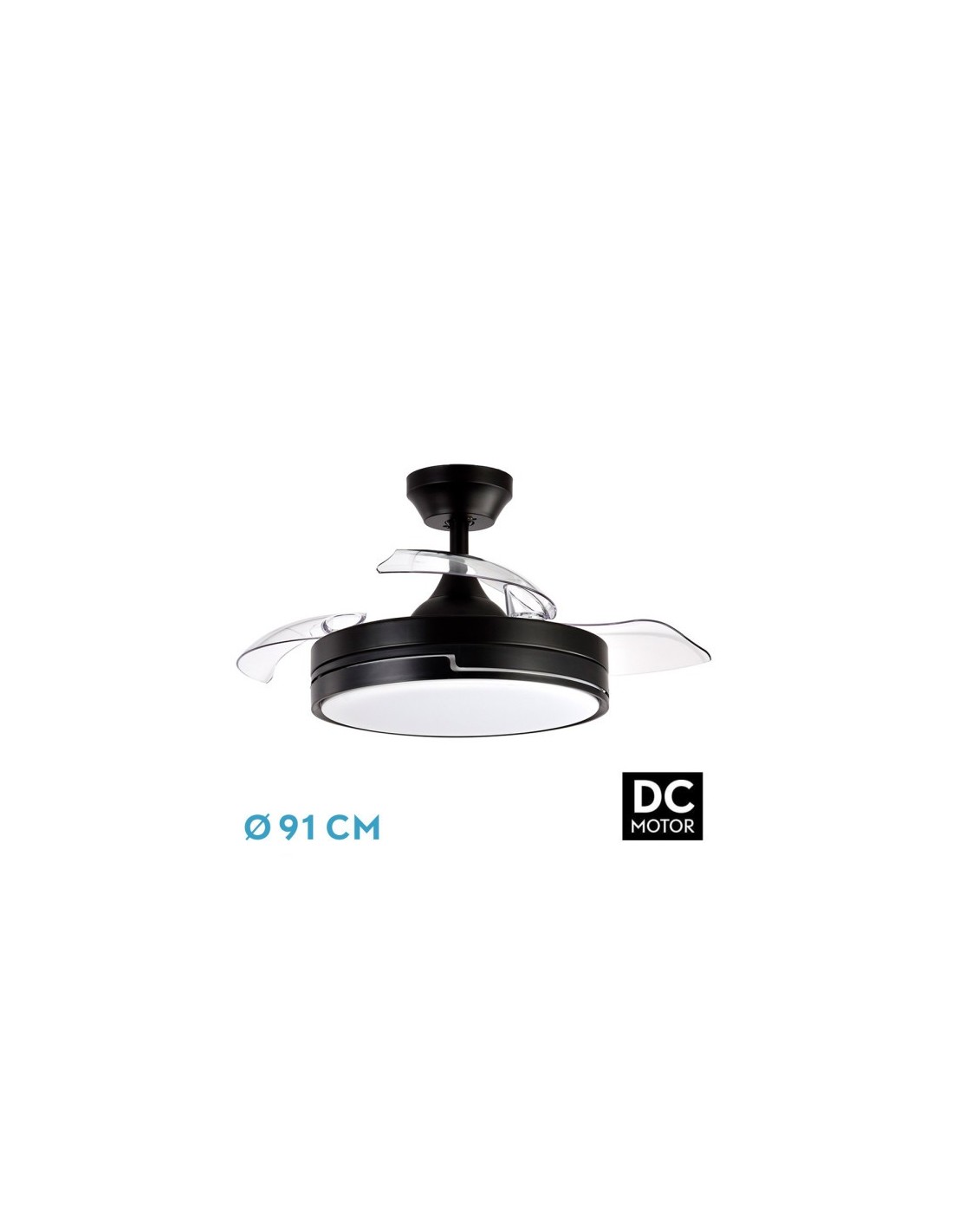 Ventilador DC serie OLIMPIA en color Negro con tres aspas DESPLEGABLES muy resistentes. Realizado en metal, ABS y policarbonato, con diseño original y elegante. Tiene seis velocidades ajustables. Tecnología LED integrada con una potencia de 48W, 3 TEMPERATURAS DE LUZ (3000-4500-6000K), luz cálida, blanco natural y blanco frío, y 4800 lúmenes. Control de aire verano o invierno. Su medida es de 34,5/47X41 centímetros con las aspas plegadas y de 34,5/47X91 centímetros con las aspas desplegadas, con DOS MEDIDAS DE TIJA incluidas para colocar a distintas alturas. Mando a distancia INCLUIDO con MEMORIA DE COLOR incorporada y TEMPORIZADOR 1/2/4/8 H. Modelo disponible en color blanco/gris, blanco/haya, negro y negro/madera, todos en dos tamaños diferentes.