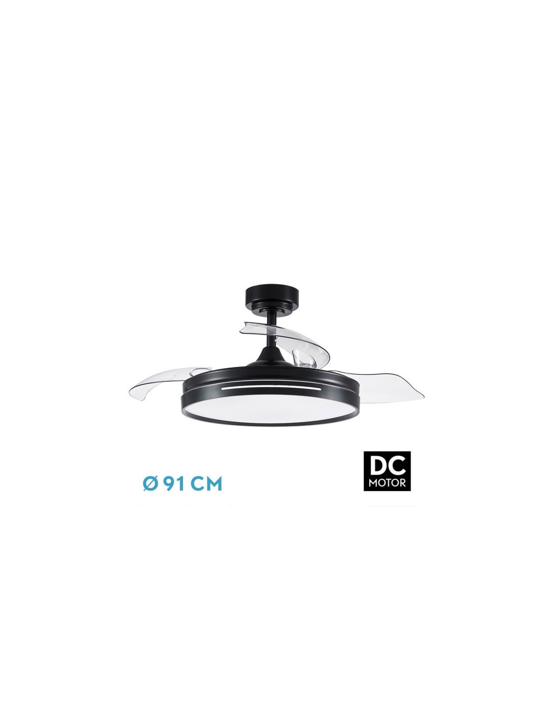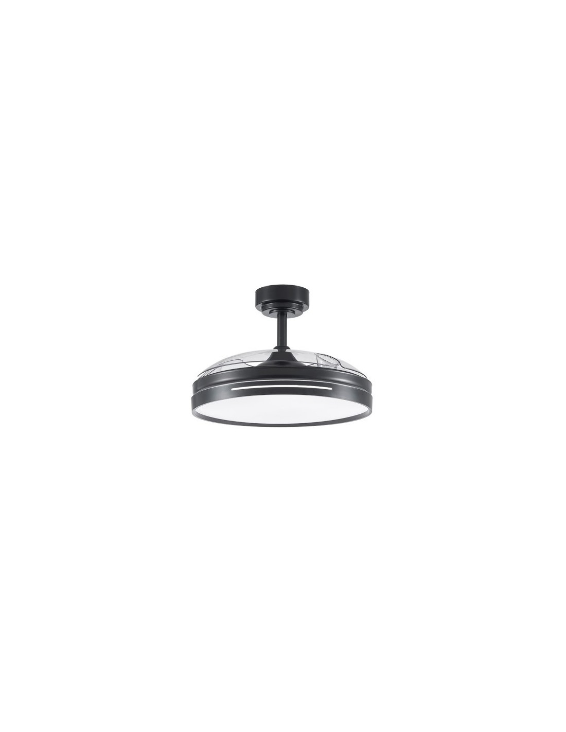 Ventilador DC serie MICENAS realizado en metal, ABS y policarbonato, en color Negro con tres aspas DESPLEGABLES en ABS muy resistentes. Tiene seis velocidades ajustables. Motor DC. Tecnología LED integrada con una potencia de 48W, con 3 TEMPERATURAS SELECCIONABLES DE LUZ (3000-4000-6000K), luz cálida, natural y blanco frío, y 4800 lúmenes. Control de aire verano o invierno. Su medida es de 32/44,5X38 centímetros con las aspas plegadas y de 32/44,5X91 centímetros con las aspas desplegadas. Incluye dos tijas de 12,5 y 25 centímetros. Mando a distancia INCLUIDO con MEMORIA DE COLOR incorporada y TEMPORIZADOR 1/2/4 H. Modelo disponible en color blanco, níquel, negro y cuero, y también en dos tamaños.