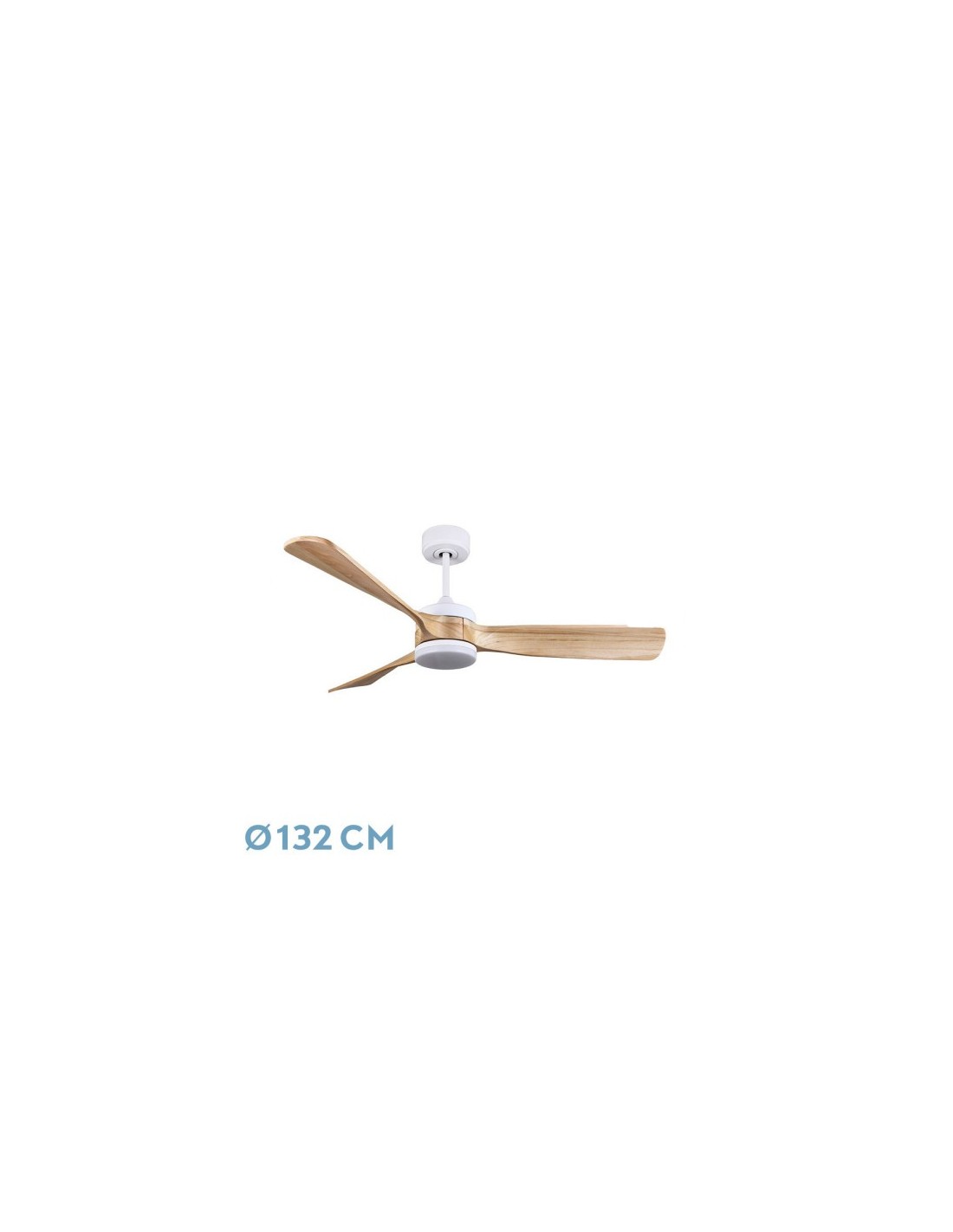 Ventilador DC de la serie ORIENTE realizado en metal, madera y policarbonato, en color Blanco con tres aspas de color Haya. Tiene seis velocidades ajustables con motor DC. Tecnología LED incorporada con una potencia de 26W, con 3 TEMPERATURAS SELECCIONABLES DE LUZ( 3000-4000-6500K) y 2950 lúmenes. Su medida es de 32/47x132x132 centímetros, incluye dos medidas de TIJA (10 cm y 25 cm), lo que permite adaptarlo a distintas alturas. Control de aire verano o invierno. Mando a distancia INCLUIDO con MEMORIA DE COLOR incorporada y TEMPORIZADOR 1/3/6 H. Modelo también disponible en negro/roble.