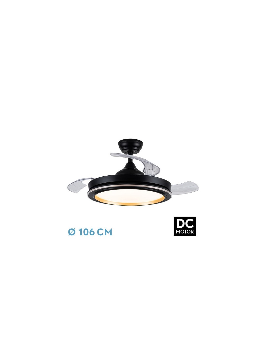 Ventilador DC de la serie PICOLO realizado en metal, policarbonato y ABS, en color Negro/Oro con tres aspas DESPLEGABLES de ABS transparente muy resistentes. Tiene seis velocidades ajustables. Tecnología LED integrada con una potencia de 72W, con 3 TEMPERATURAS SELECCIONABLES DE LUZ (3000-4000-6000K) y 6226 lúmenes. Control de aire verano o invierno. Su medida es de 38/50,5X49,5 centímetros con las aspas plegadas y de 38/50,5X106 centímetros con las aspas desplegadas. Incluye dos tijas de 12,5 y 25 centímetros, para colocar a distintas alturas. Mando a distancia INCLUIDO con MEMORIA DE COLOR incorporada y TEMPORIZADOR 1/3/6 H.