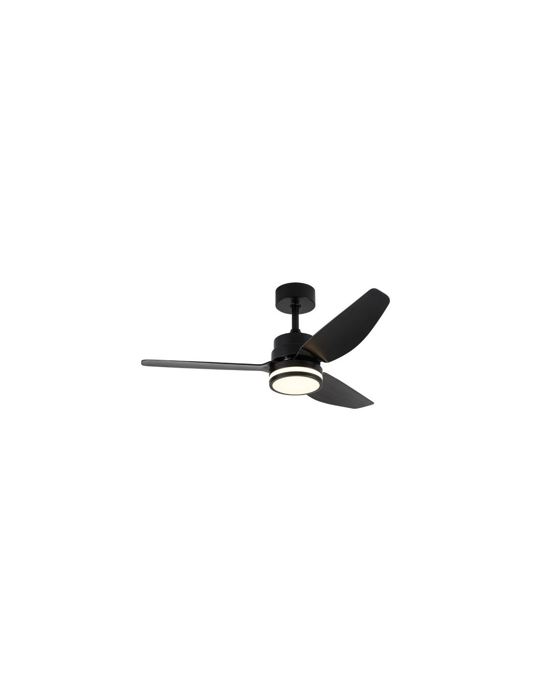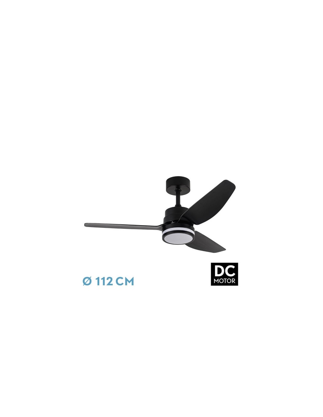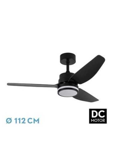 Ventilador DC JARAMA realizado en metal, ABS y policarbonato, en color Negro con tres aspas. Tiene seis velocidades ajustables. Tecnología LED incorporada con una potencia de 20W, con 3 TEMPERATURAS DE LUZ( 3000-4000-6500K) y 2350 lúmenes. Su medida es de 38/48X112X112 centímetros, viene con dos medias de TIJA para colocar a distintas alturas. Control de aire verano e invierno. Mando a distancia INCLUIDO con MEMORIA DE COLOR incorporada y TEMPORIZADOR 1/2/4 H. Modelo disponible en Blanco y en Negro.