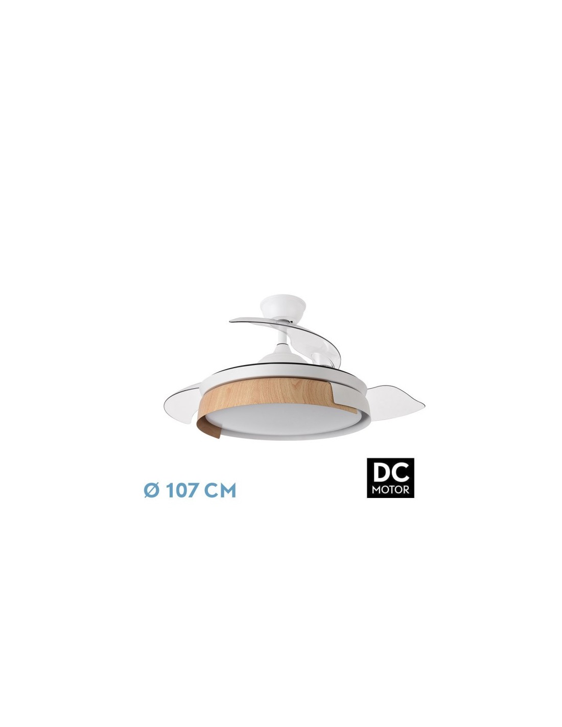 Ventilador DC de la serie PROVENZA realizado en metal, policarbonato y ABS, en color Blanco/Haya con tres aspas DESPLEGABLES de ABS transparente muy resistentes. Tiene seis velocidades ajustables. Tecnología LED integrada con una potencia de 72W, con 3 TEMPERATURAS SELECCIONABLES DE LUZ (3000-4000-6000K) y 7200 lúmenes. Control de aire verano o invierno. Su medida es de 36/51X50 centímetros con las aspas plegadas y de 36/51X107 centímetros con las aspas desplegadas. Incluye dos tijas de 10 y 25 centímetros, para colocar a distintas alturas. Mando a distancia INCLUIDO con MEMORIA DE COLOR incorporada y TEMPORIZADOR 1/2/4 H. Modelo disponible en color negro/haya y en color blanco/haya.