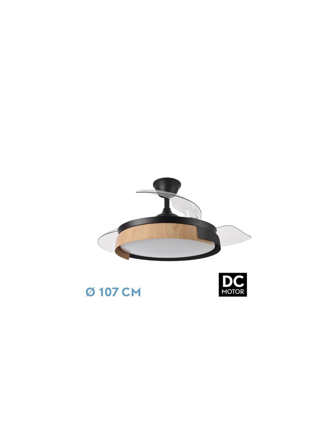 Ventilador DC de la serie PROVENZA realizado en metal, policarbonato y ABS, en color Negro/Haya con tres aspas DESPLEGABLES de ABS transparente muy resistentes. Tiene seis velocidades ajustables. Tecnología LED integrada con una potencia de 72W, con 3 TEMPERATURAS SELECCIONABLES DE LUZ (3000-4000-6000K) y 7200 lúmenes. Control de aire verano o invierno. Su medida es de 36/51X50 centímetros con las aspas plegadas y de 36/51X107 centímetros con las aspas desplegadas. Incluye dos tijas de 10 y 25 centímetros, para colocar a distintas alturas. Mando a distancia INCLUIDO con MEMORIA DE COLOR incorporada y TEMPORIZADOR 1/2/4 H. Modelo disponible en color negro/haya y en color blanco/haya.