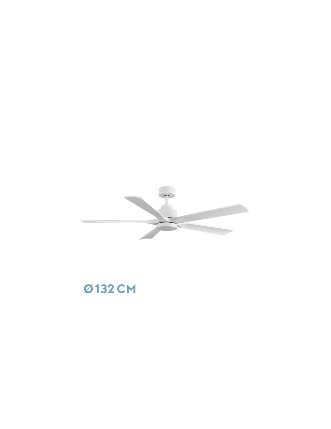 Ventilador DC de la serie CAIRO realizado en metal, madera y policarbonato, en color Blanco con cinco aspas. Tiene seis velocidades ajustables con motor DC. Tecnología LED incorporada con una potencia de 24W, con 3 TEMPERATURAS SELECCIONABLES DE LUZ( 3000-4500-6000K) y 2400 lúmenes. De diseño moderno y elegante, de gran tamaño, ideal para salones, comedores, espacios abiertos y zonas de trabajo. Tiene unas dimensiones de 34,5/47x132x132 centímetros, incluye dos medidas de TIJA (12,5 cm y 25 cm), lo que permite adaptarlo a distintas alturas. Control de aire verano o invierno. Mando a distancia INCLUIDO con MEMORIA DE COLOR incorporada y TEMPORIZADOR 1/2/4/8 H. Modelo disponible en color blanco/haya, negro y blanco.