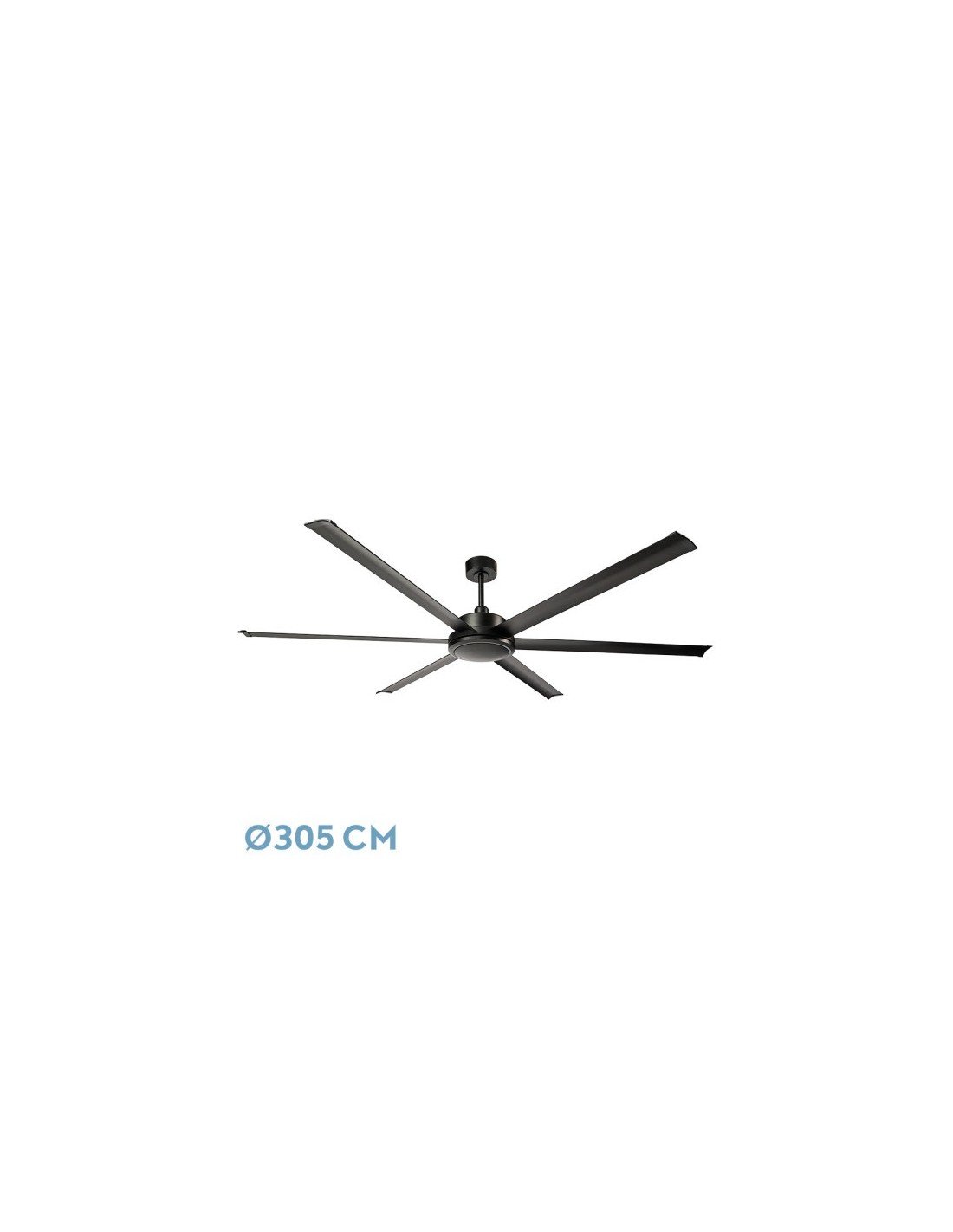 Ventilador DC de la serie SANSON sin luz incorporada, realizado en metal y aluminio, en color Negro con seis aspas. Tiene seis velocidades ajustables con motor DC y una potencia de 55 watios. Ventilador de gran tamaño con aspas en aluminio, ideal para locales, oficinas, salones y estancias abiertas, con un diseño muy moderno y elegante, tomando parte en la decoración de su hogar o trabajo. Tiene unas dimensiones de 47/60x305x305 centímetros, incluye dos medidas de TIJA lo que permite instalarlo a distintas alturas de techo. Control de aire verano o invierno. Mando a distancia INCLUIDO y TEMPORIZADOR que permite programar para que el ventilador se apague automáticamente a las 1/2/4/8 horas, lo que conlleva un gran ahorro de energía. Modelo disponible en dos tamaños y en en los colores níquel/plata y negro.