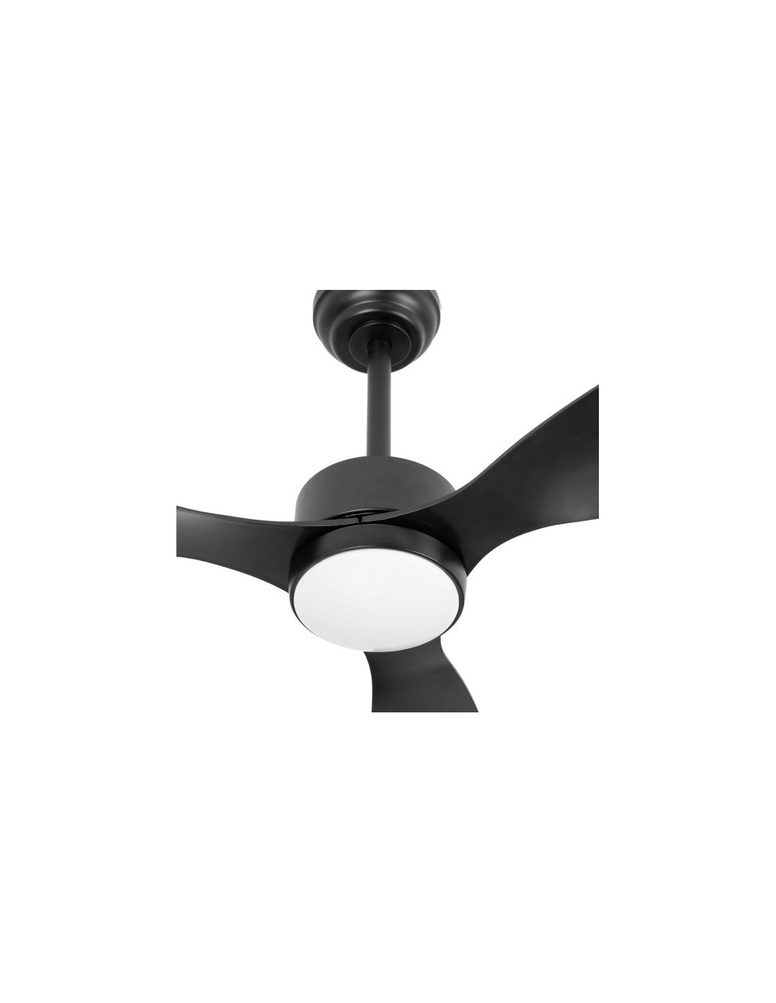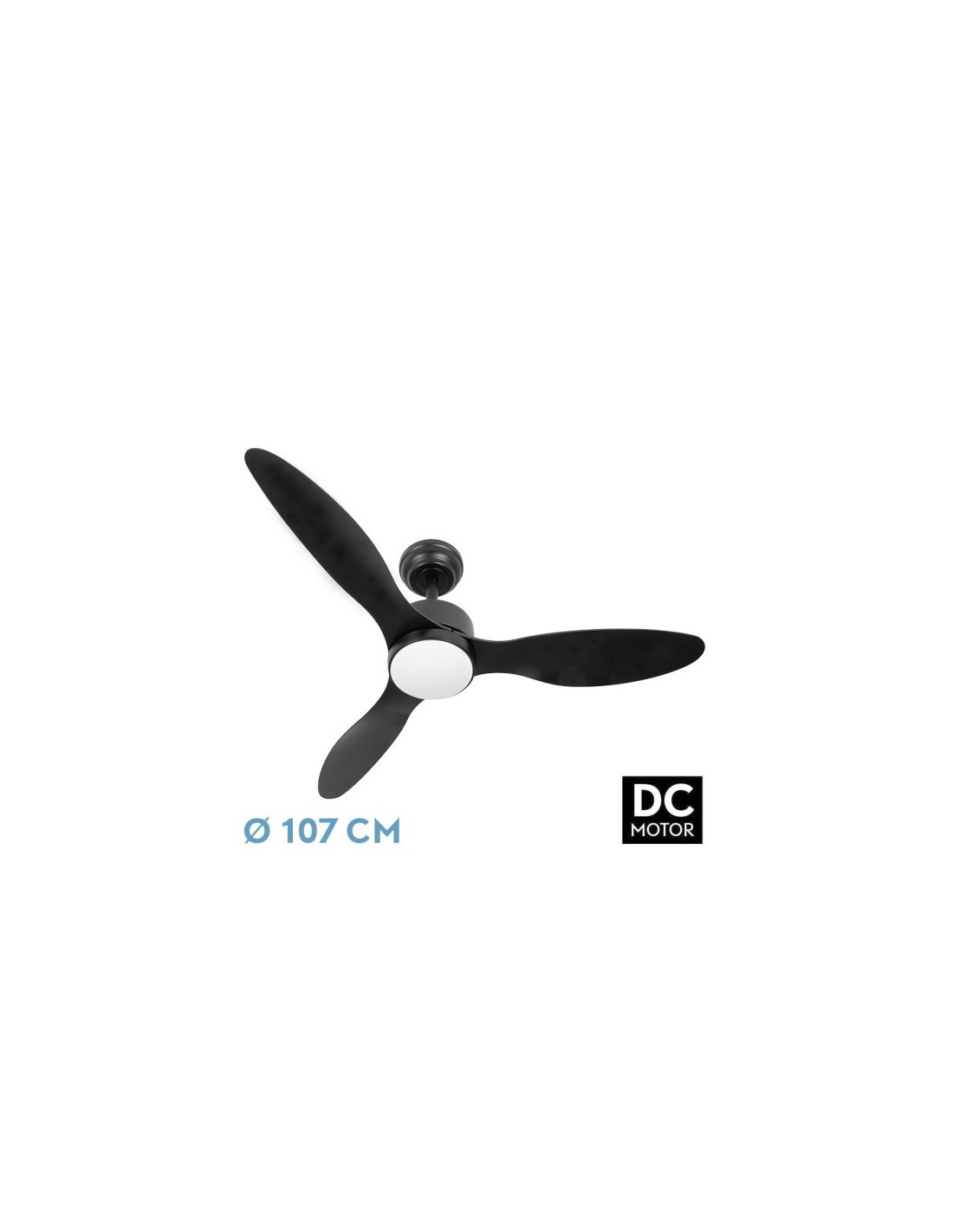 Ventilador DC de la serie SERPA de color Negro con 3 aspas. Realizado en metal, ABS y policarbonato. Tiene una medida de 32,5/45x107x107 centímetros. Motor DC. Tecnología LED integrada con una potencia de 24W, 2424 lúmenes y COLOR DE LUZ SELECCIONABLE EN 3 TEMPERATURAS (3000-4000-6500K) luz cálida, natural y blanco frío. Dispone de control remoto con 6 velocidades diferentes, memoria de color, modo de verano/invierno, temporizador de 2/4/8 horas y Regulador de Intensidad. Incluye dos tijas de 12,5 y 25 centímetros para instalar en techos a distintas alturas. Modelo disponible en color blanco, en negro y en blanco/haya.