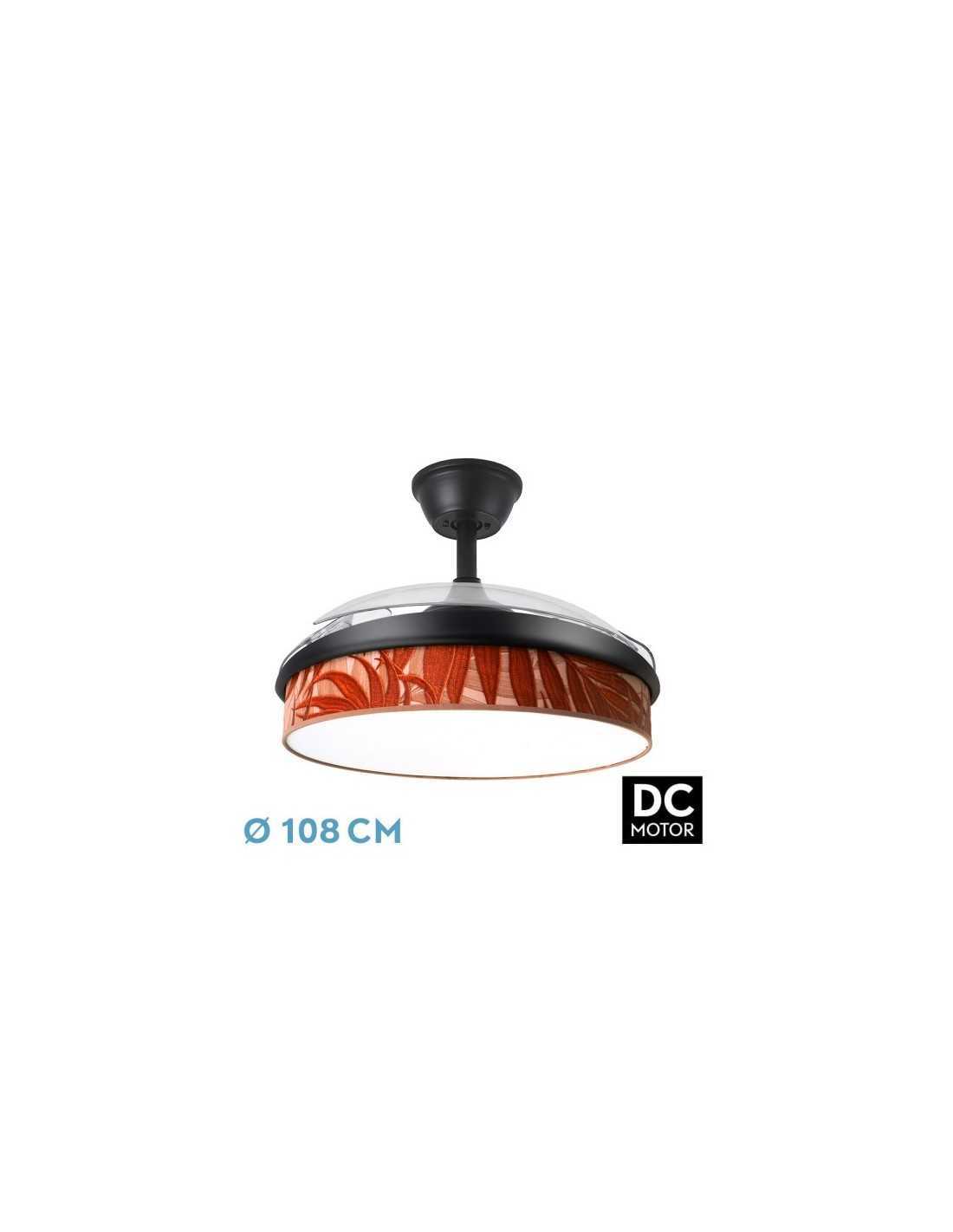 Exclusivo y original ventilador DC de la serie MODA con tres aspas DESPLEGABLES de ABS, en color Negro con difusor HOJA CALDERA. Realizado en metal, ABS, textil y policarbonato. De estilo moderno y versátil, los diseños y colores de sus difusores hacen que este ventilador tanto en funcionamiento como en sólo modo lámpara, se haga el centro de atención de la habitación que ilumina. Ideal tanto para ambientes modernos como clásicos, muy acorde con los nuevos estilos de decoración combinando colores y texturas. Motor DC con seis velocidades ajustables. Tecnología LED integrada con una potencia de 72W, 7200 lúmenes y con 3 TEMPERATURAS SELECCIONABLES DE LUZ (3000-4000-6000K). Control de aire verano o invierno. Su medida es de 39/54X49X49 centímetros con las aspas plegadas y de 39/54X108X108 centímetros con las aspas desplegadas, con dos medidas de tija para instalarlo a diferentes alturas. Mando a distancia INCLUIDO con MEMORIA DE COLOR incorporada y TEMPORIZADOR 1/2/4 horas. Modelo disponible tanto en negro como en blanco y con una gran variedad de diseños y colores en sus difusores.