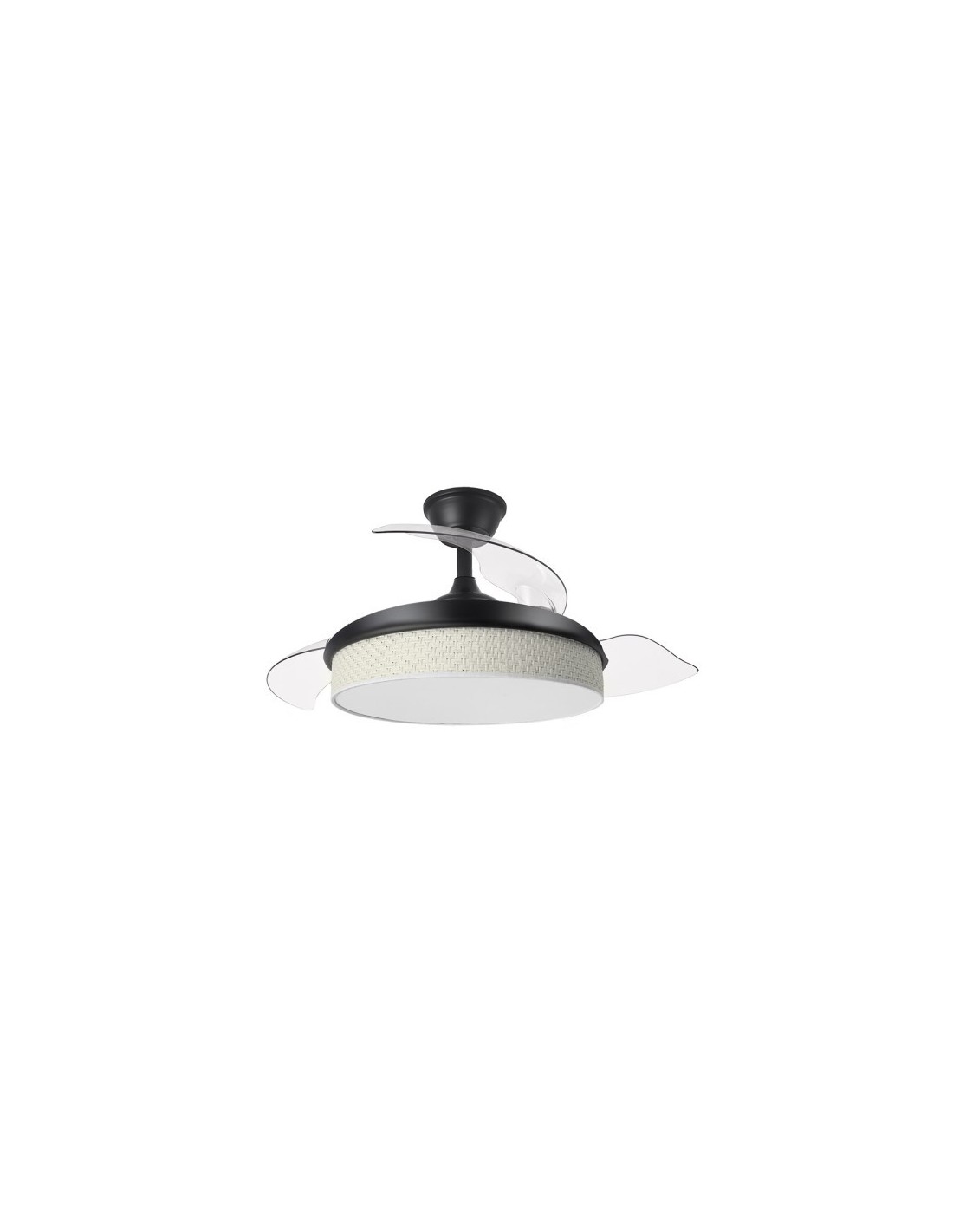 Exclusivo y original ventilador DC de la serie MODA con tres aspas DESPLEGABLES de ABS, en color Negro con difusor CAÑIZO Blanco. Realizado en metal, ABS, textil y policarbonato. De estilo moderno y versátil, los diseños y colores de sus difusores hacen que este ventilador tanto en funcionamiento como en sólo modo lámpara, se haga el centro de atención de la habitación que ilumina. Ideal tanto para ambientes modernos como clásicos, muy acorde con los nuevos estilos de decoración combinando colores y texturas. Motor DC con seis velocidades ajustables. Tecnología LED integrada con una potencia de 72W, 7200 lúmenes y con 3 TEMPERATURAS SELECCIONABLES DE LUZ (3000-4000-6000K). Control de aire verano o invierno. Su medida es de 39/54X49X49 centímetros con las aspas plegadas y de 39/54X108X108 centímetros con las aspas desplegadas, con dos medidas de tija para instalarlo a diferentes alturas. Mando a distancia INCLUIDO con MEMORIA DE COLOR incorporada y TEMPORIZADOR 1/2/4 horas. Modelo disponible tanto en negro como en blanco y con una gran variedad de diseños y colores en sus difusores.