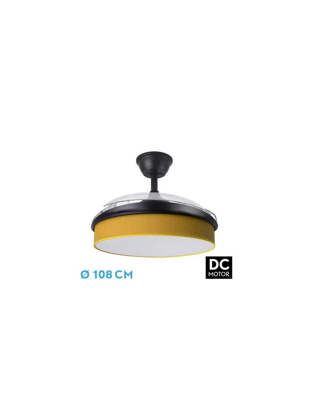 Exclusivo y original ventilador DC de la serie MODA con tres aspas DESPLEGABLES de ABS, en color Negro con difusor AMARILLO. Realizado en metal, ABS, textil y policarbonato. Diseño muy moderno y versátil, las decoraciones y colores de sus difusores hacen que este ventilador tanto en funcionamiento como en sólo modo lámpara, se haga el centro de la habitación que decore. Motor DC con seis velocidades ajustables. Tecnología LED integrada con una potencia de 72W, 7200 lúmenes y con 3 TEMPERATURAS SELECCIONABLES DE LUZ (3000-4000-6000K). Control de aire verano o invierno. Su medida es de 39/54X49X49 centímetros con las aspas plegadas y de 39/54X108X108 centímetros con las aspas desplegadas, con dos medidas de tija para instalarlo a diferentes alturas. Mando a distancia INCLUIDO con MEMORIA DE COLOR incorporada y TEMPORIZADOR 1/2/4 H. Modelo disponible tanto en negro como en blanco y con una gran variedad de diseños en sus difusores.