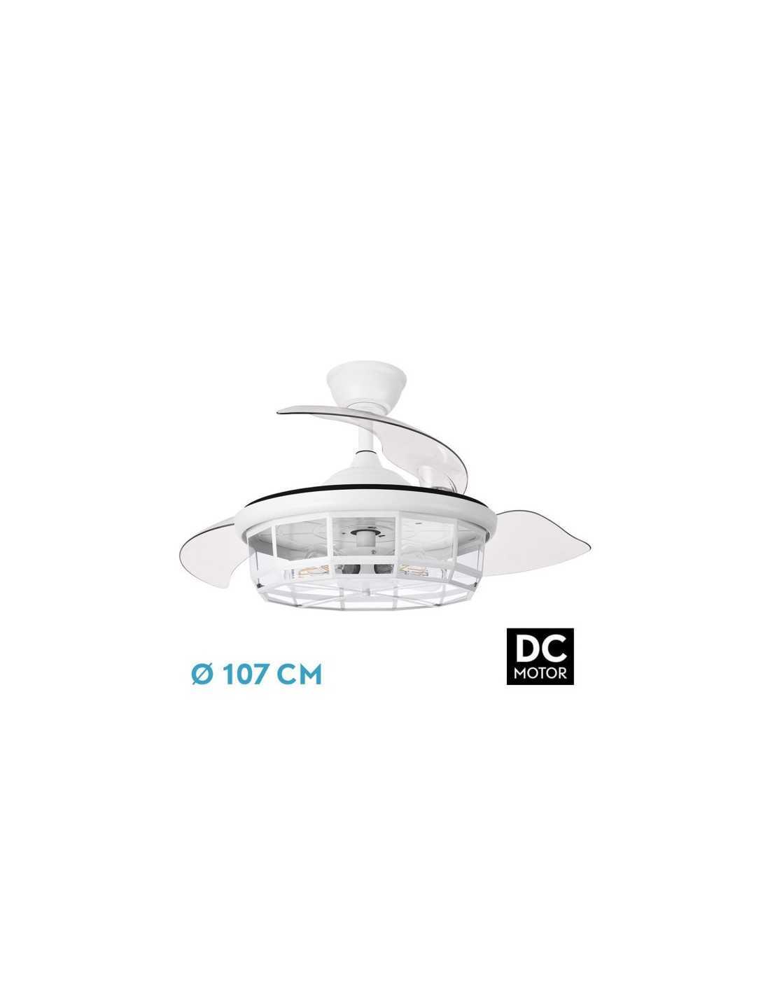 Ventilador DC de la serie TORNADO realizado en metal y acrílico efecto cristal, en color Blanco con tres aspas RETRÁCTILES de ABS transparente muy resistentes. Posee 5 portalámparas E27, bombillas no incluidas. Motor DC, tiene seis velocidades ajustables. De diseño moderno gracias a sus aspas desplegables, pero muy acorde con varios estilos de decoración desde el clásico al Frame House o incluso el Vintage, su terminación nos recuerda a las lámparas de cristal emplomado, resultando un elemento muy decorativo para salones, dormitorios, comedores y zonas de trabajo, pudiendo usarse conjuntamente o indistintamente como lámpara o ventilador dependiendo de las necesidades de la estancia. Recuerde retirar la película protectora que trae su tulipa. Viene con MANDO A DISTANCIA, TEMPORIZADOR 1/2/4 y control de aire verano o invierno. Su medida es de 41/56X50 centímetros con las aspas plegadas y de 41/56X107 centímetros con las aspas desplegadas. Incluye dos tijas de 10 y 25 centímetros, para colocar a distintas alturas. Modelo disponible con terminaciones en negro, cuero o blanco y en dos tamaños diferentes para adaptar el que mejor venga con su decoración.