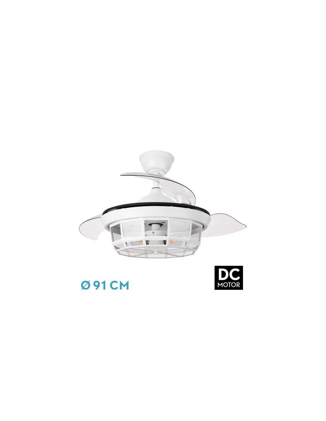 Ventilador DC de la serie TORNADO MINI, realizado en metal y acrílico efecto cristal, en color Blanco con tres aspas RETRACTILES de ABS transparente muy resistentes. Posee 3 portalámparas E27, bombillas no incluidas. Motor DC, tiene seis velocidades ajustables. De diseño moderno gracias a sus aspas desplegables, pero muy acorde con varios estilos de decoración desde el clásico al Frame House o incluso el Vintage, su terminación nos recuerda a las lámparas de cristal emplomado, resultando un elemento muy decorativo para salones, dormitorios, comedores y zonas de trabajo, pudiendo usarse conjuntamente o indistintamente como lámpara o ventilador dependiendo de las necesidades de la estancia. Recuerde retirar la película protectora que trae su tulipa. Viene con MANDO A DISTANCIA, TEMPORIZADOR 1/2/4 y control de aire verano o invierno. Su medida es de 40/55X40 centímetros con las aspas plegadas y de 40/55X91 centímetros con las aspas desplegadas. Incluye dos tijas de 10 y 25 centímetros, para colocar a distintas alturas. Modelo disponible con terminaciones en negro, cuero o blanco y en dos tamaños diferentes para adaptar el que mejor venga con su decoración.