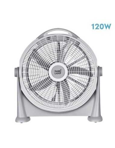 Ventilador de sobremesa de la serie FRESCO realizado en policarbonato, de color Gris con cinco aspas y tres velocidades. Motor AC. Cabezal orientable en el plano vertical, pudiendo redirigir el aire a la zona que desee. Dispone de una útil asa en su estructura, lo que lo hace fácil de transportar. Tiene una potencia de 120 watios y una medida de 62x58x16 centímetros.