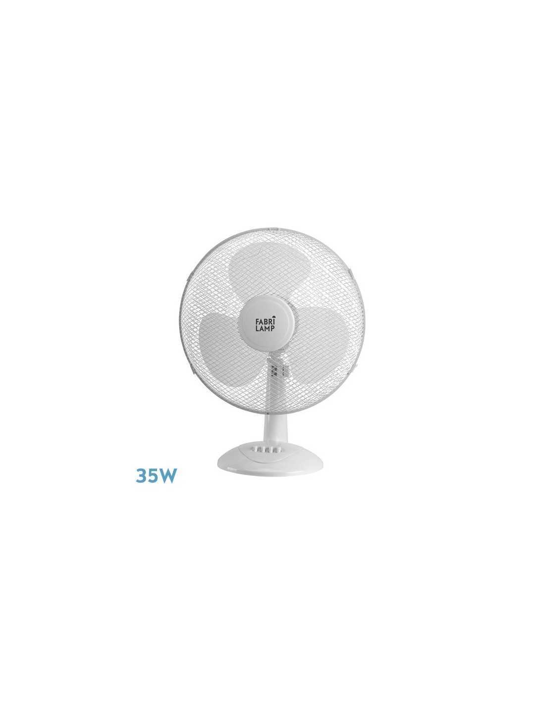 Ventilador de sobremesa de la serie CAPE mediano, realizado en metal y policarbonato, de color Blanco con tres aspas y tres velocidades. Motor AC. Cabezal con dos posiciones, fijo y rotatorio, también oscilante, pudiendo redirigir el aire a la zona que desee. Tiene una potencia de 35 watios y una medida de 47,5x34x20 centímetros. Con tres tamaños diferentes en esta misma serie.