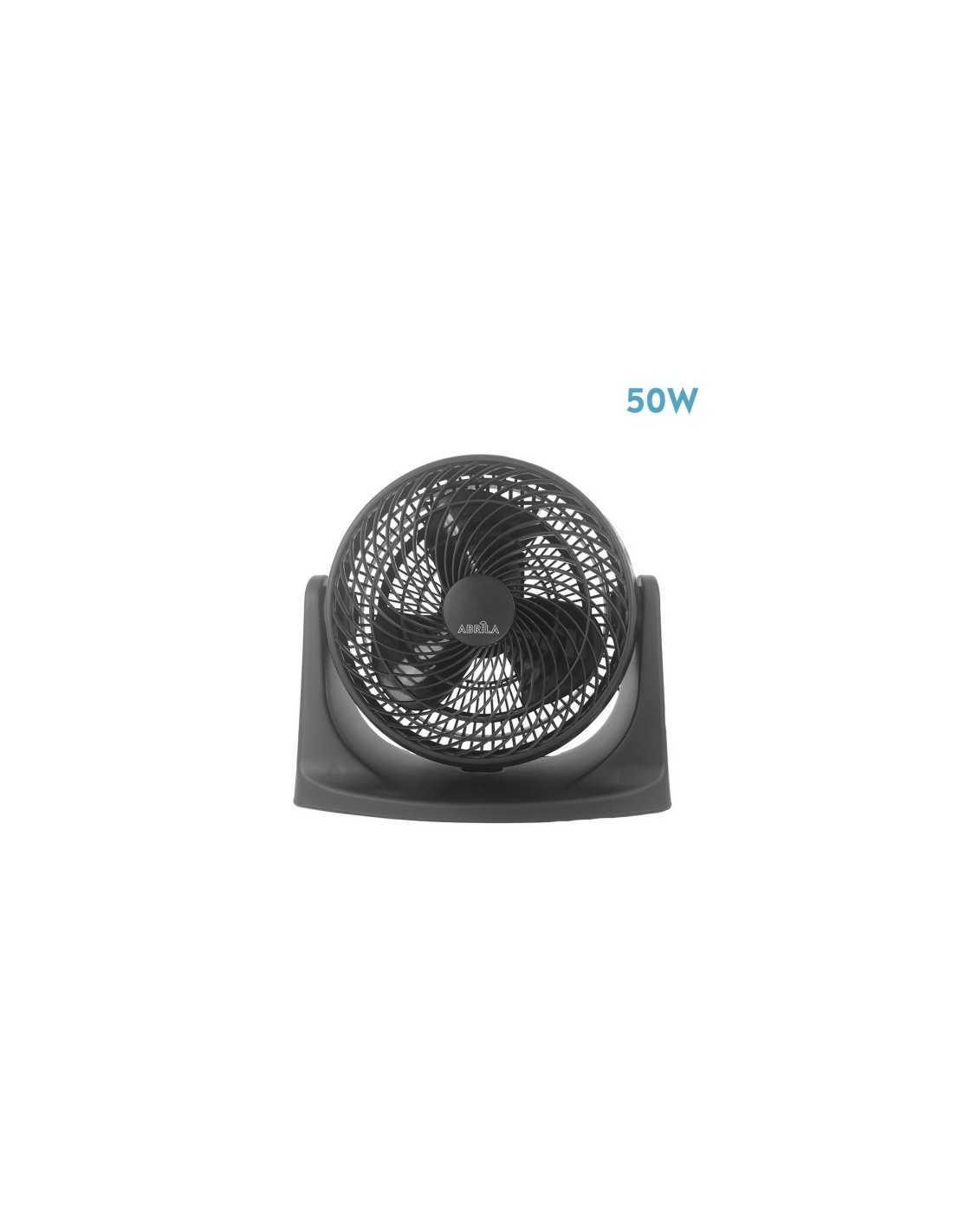 Ventilador de sobremesa de la serie BALBOA realizado en policarbonato, de color Negro con tres aspas y tres velocidades. Motor AC. Cabezal orientable en el plano vertical, pudiendo redirigir el aire a la zona que desee. Ligero y de pequeño tamaño, pudiéndose utilizar tanto en suelos como sobre una encimera, fácil de transportar. Tiene una potencia de 50 watios y una medida de 26x28,5x26 centímetros. Modelo disponible en blanco y en negro.