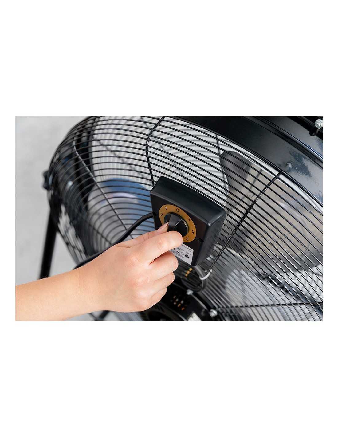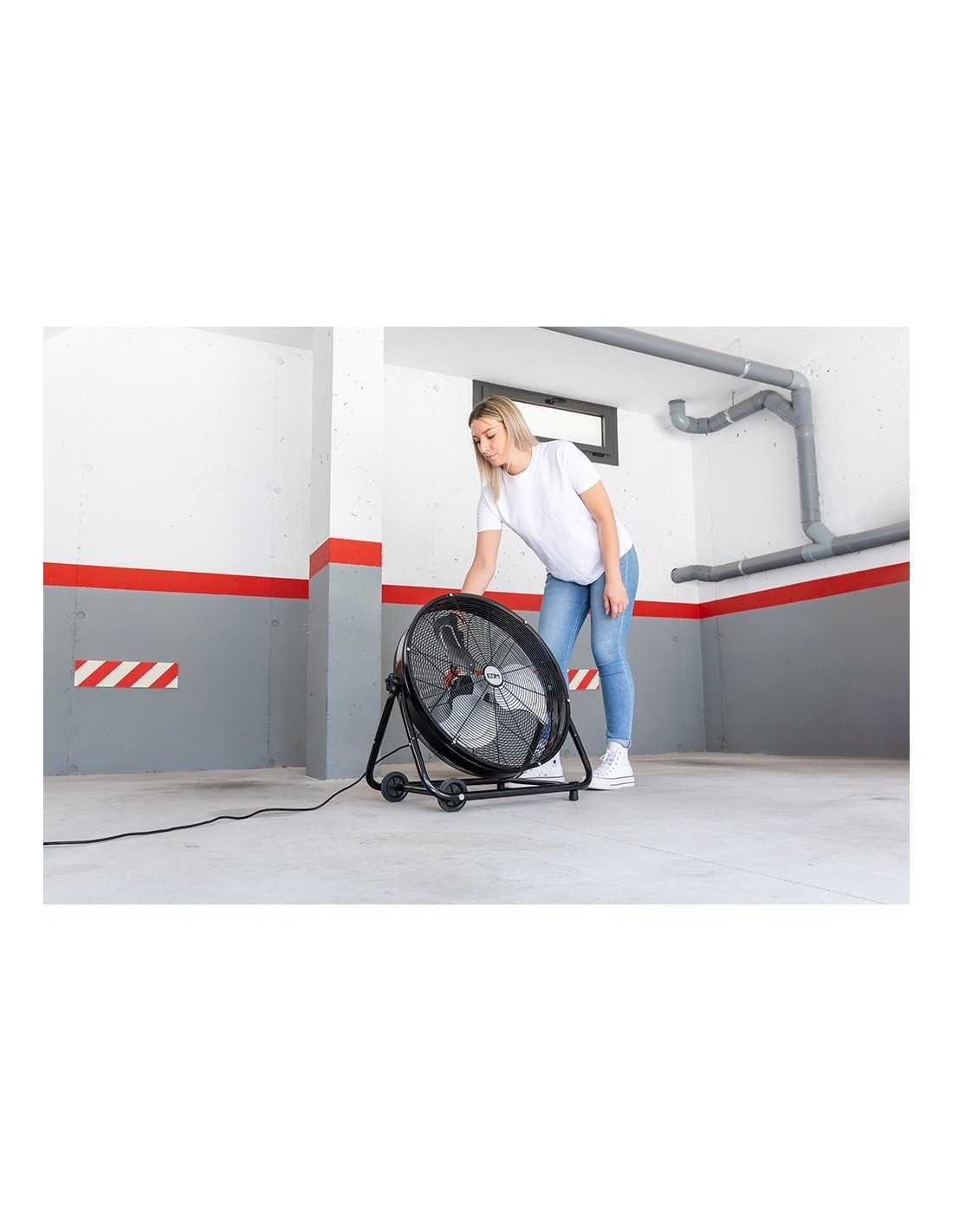 El ventilador presenta un acabado en color negro, lo que le da un aspecto industrial y moderno, adecuado para una variedad de ambientes. Su estructura de suelo lo hace ideal para espacios donde no se desea un ventilador de techo o de mesa. Además, sus ruedas permiten moverlo fácilmente a diferentes áreas según sea necesario, optimizando su uso.